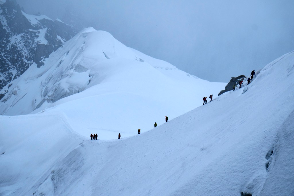 Vi pakkede hurtigt om og klargjorde til en bestigning. Naturligvis skulle vi have en flyvende start, så hvorfor ikke tage kabelbanen til Aiguille du Midi, det er da allerede de første 3800 meter! Det var naturligvis en skidt ide, idet vi ikke var tilvænnet højderne. Men op kom vi og slog telt op på et kæmpe plateau under Aiguille du Midi.