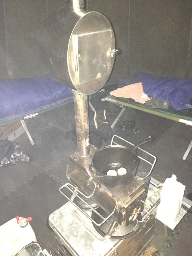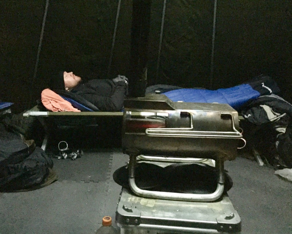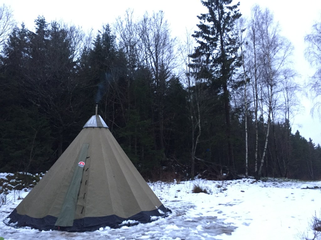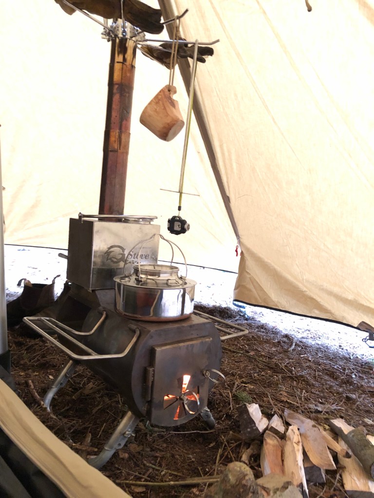 Selvom sneen ikke var tilstede, lå temperaturen og balancerede på 0 grader. Efter 10 minutter i teltet, havde kaminen gjort sit. Af med jakke og nu siddende i t-shirt og nørkle med lynlåse. G-stowe kaminen fungerer fremragende. Kombineret med vandvarmer, tørrestativ og bageovn er der luksus til alle der ikke har vægt- eller plads begrænsninger. Kaminen varmer hurtigt et telt til 6 personer og vandvarmeren sørger for 3 liter kogende vand. Vandvarmeren kan du tage med ud af teltet eller flytte fra kaminen- og så er der tap-hane på. Genialt!