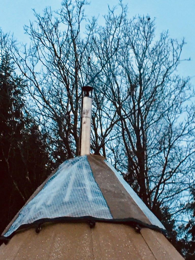 Fredagen blev en kort dag, to møder aflyst- Så jeg hastede hjem og kunne allerede ved 12 tiden rode rundt med telt og kamin. Liggende i haven kunne jeg nyde varmen fra kaminen, drikke Chaka-the og dermed teste den nye bål kedel. Teltet fik samtidig nye og længere snore i lynlåsen. De længere snore holder jeg af, specielt i vinteren hvor luffer ofte er i brug. Endelig vil jeg helst have en snor der har fat i selve lynlåsen, og ikke blot i “blik stumpen”.
