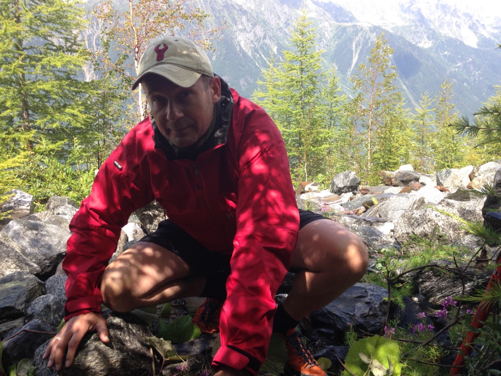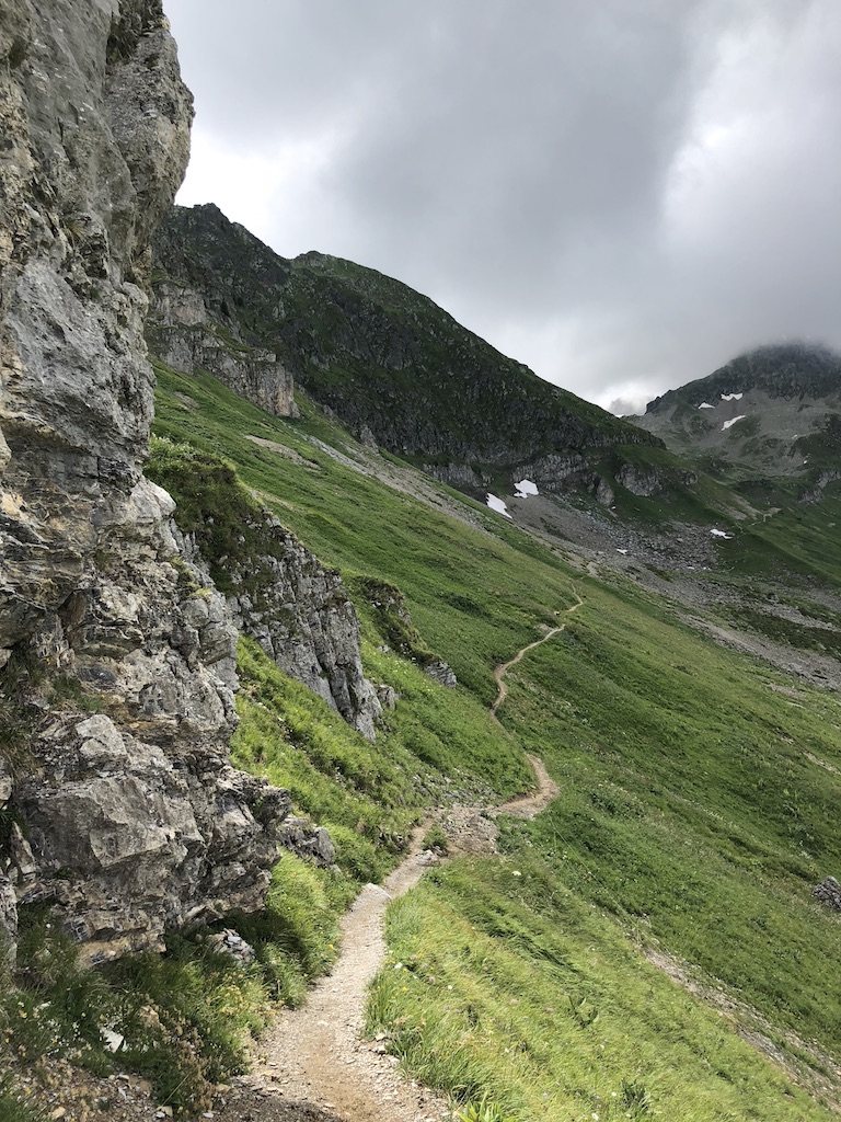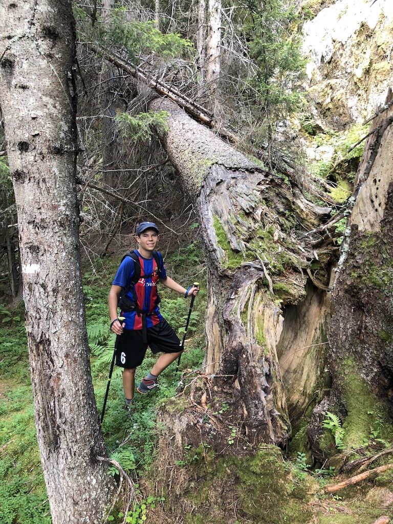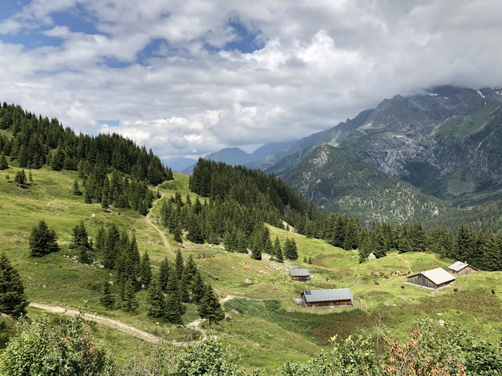 Efter frokostpausen gik vi mod dalen. Miljøet blev hurtigt varmere og vi rendte ind i hyggelige bjerghytter hvor landmænd havde fundet deres hjem. Inden længe var trægrænsen nået og vi navigerede ned gennem dalen igennem mose og gammel uberørt skov. Endelig nåede vi ned til “Trail du MontBlanc”- som er en perle af en trekking rute. Dog er der mange der går små dele af den, så her er der altid chance for at møde andre. Vi mødte en stor flok Japanere som åbenbart ikke satsede på let oppakning. Bagerst gik en meget lille mand med en kæmpe rygsæk. Han haltede voldsomt og var pakket godt ind, så han kunne holde kroppen på kogepunktet. Vi kunne hurtigt regne ud at gruppen kun havde tilbagelagt 5-6 km, så det blev vist en dag i helvede for ham.