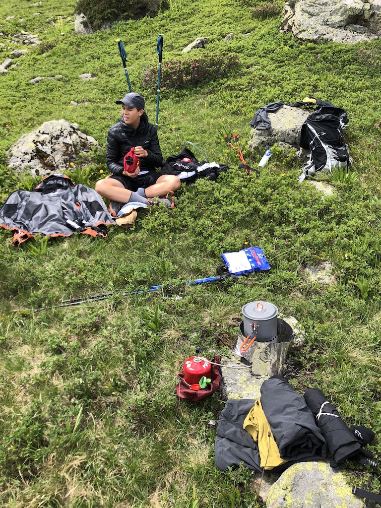 Vi fandt et perfekt sted, i solen og med helt læ for vinden. En god lang frokostpause hvor der er tid til at kikke på sine fødder, tørre vådt tøj og snuppe en lille lur. Ultra Let kogegrej i Titanium, købt på AliExpress fungerer upåklageligt. 1,5 liters gryde med låg samt indbygget “heat absorber” vejer i omegnen af 400 gram. Primus laver glimrende brændere, her er Express Spider til gas et nobelt valg på 200 gram. Et flot kombineret sæt der koger vand som lyn og torden.