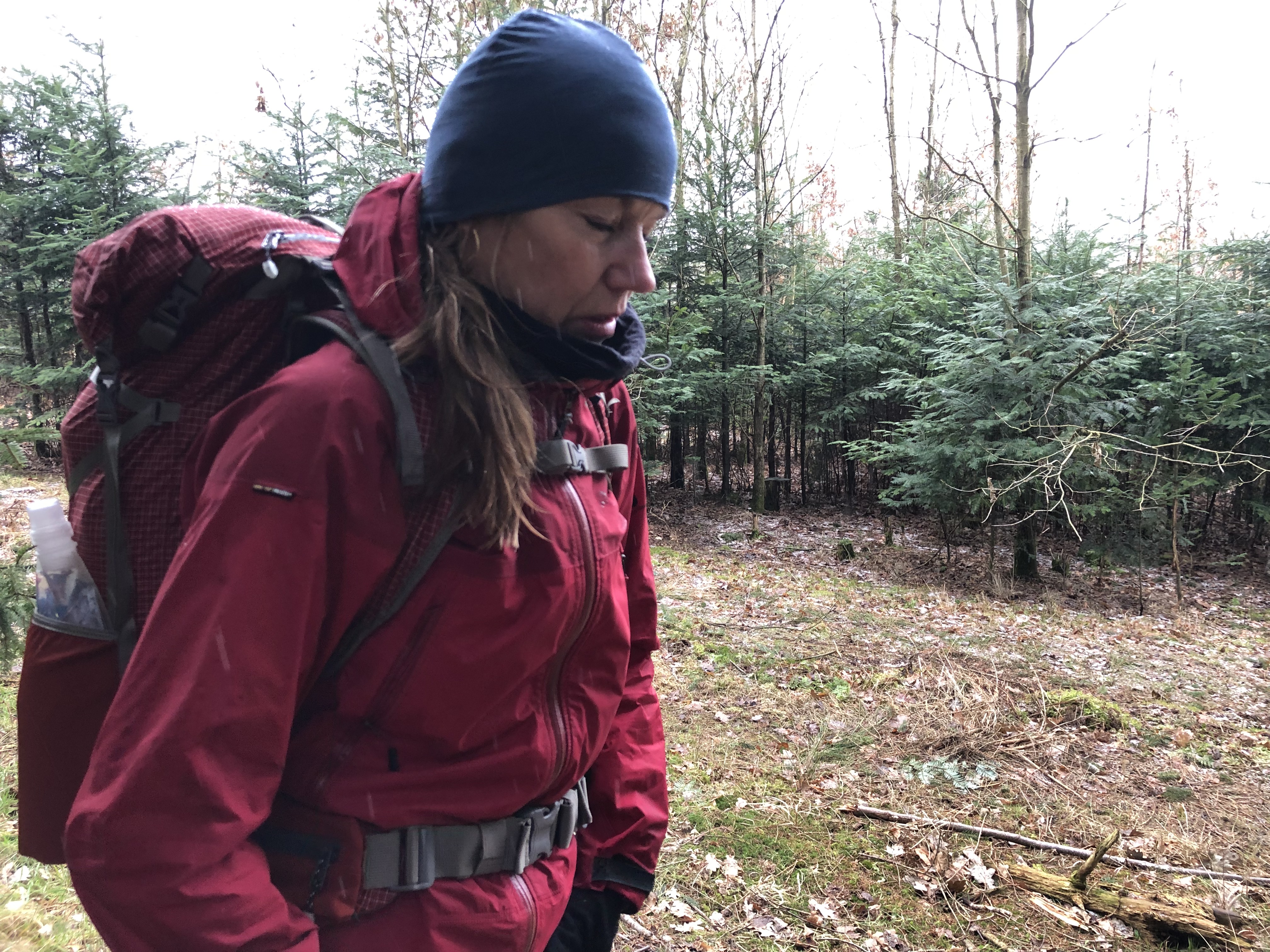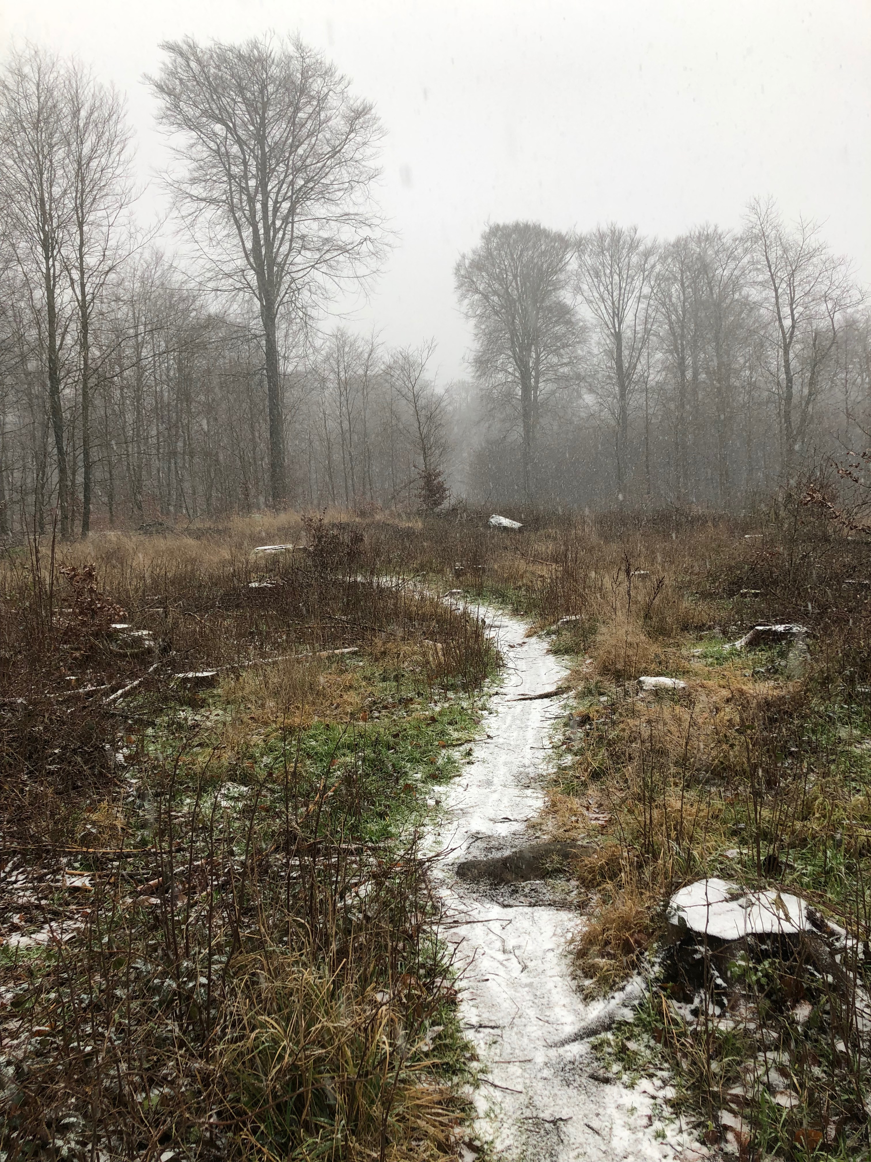 Efter lidt justering af rygsækkene var vi klar. Efter få minutter begyndte det at sne, hvilket blot satte stemningen i top. Mens vi gik hyggesludrede vi om dagligdags småting samt kommende skitur i Alperne. Det plejer at virke vanddrivende at gå, og ikke længe efter start tog vi en kort pause til at klare den indre oversvømmelse. Det er her let at være mand, men jeg må indrømme at min kones elegance udi toiletbesøg under åben himmel, kun efterlader et ord: Professionelt! Hun er jo også vant til det.