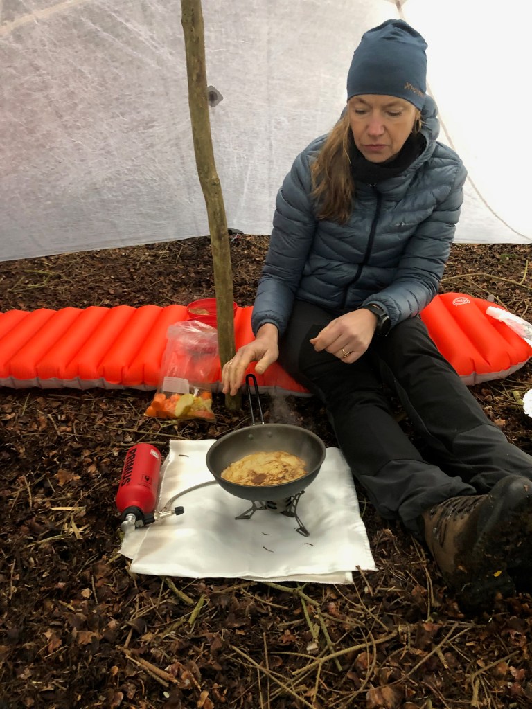 Det blev frokost og sneen skiftede konsistens. Nu var det slud og vinden friskede lidt op. Jeg fandt en granlund, med udsigt over en lille sø. Her blev teltet sat. Når jeg nu er en “heldig kartoffel”, skal der også skrues op for komforten- så hun har det tåleligt. Det er samtidig en del af vores rollefordeling. Hun sørger for maden, jeg sørger for udstyret og for etablering af lejren. Hun laver maden mens jeg sørger for brænde og læ/ly. Pandekager var på menuen, sammen med æbler og gulerødder. Hertil lavede vi en særlig the, hvis indhold står hen i det uvisse. Men en god smag, hvis man helt mangler kaffe.