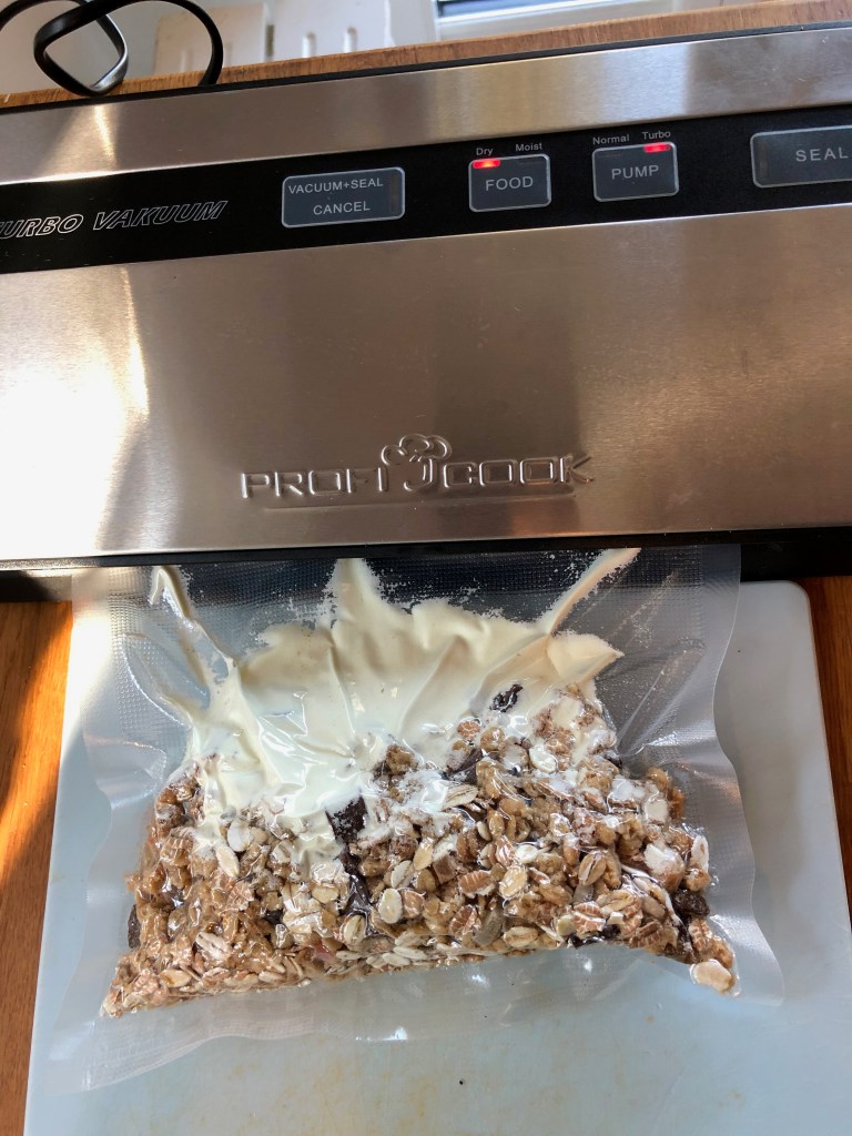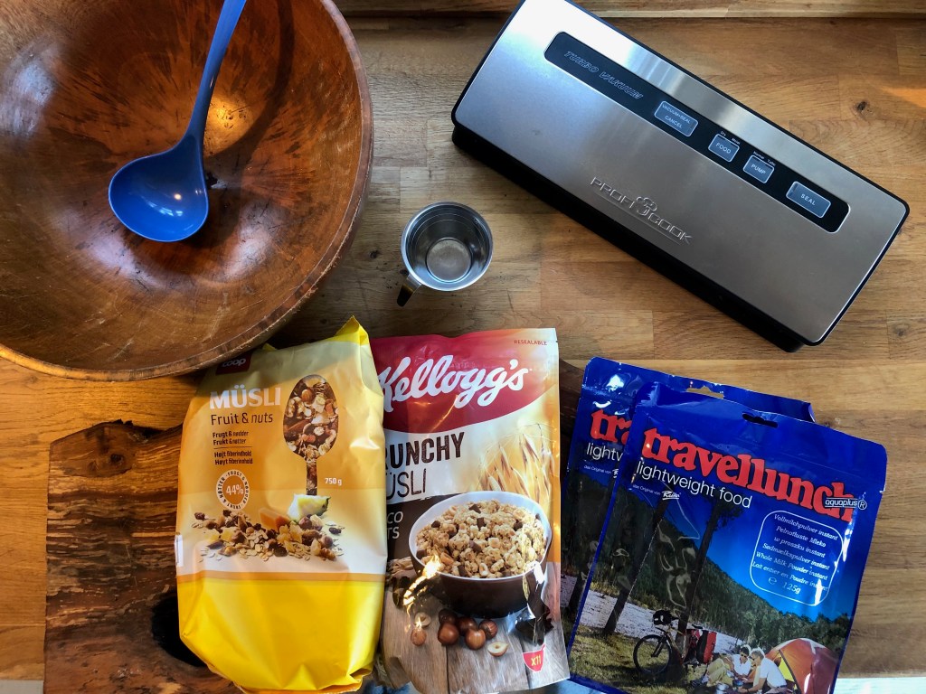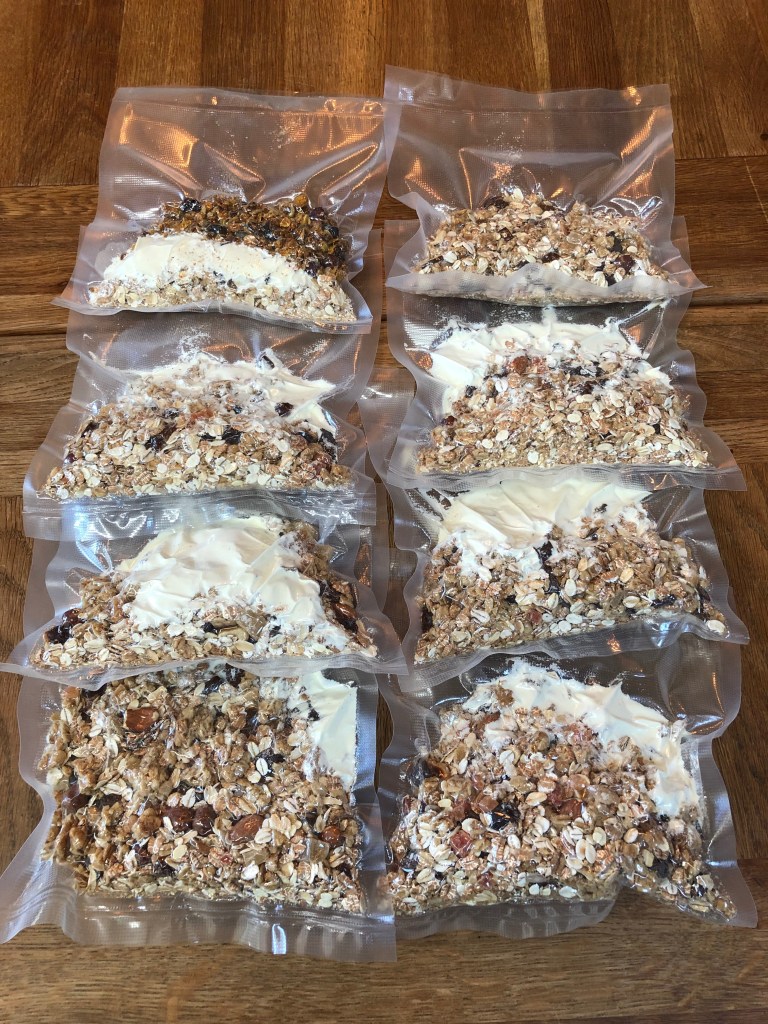Jeg køber stadig tørkost og elsker varm mad både frokost og aften- specielt i vinterfjeldet. Men jeg laver selv min morgenmad og min tur-snack. Morgenmaden består af to-tre forskellige slags müsli- og gerne en enkelt med lidt mørk chokolade i. Alle slags müsli hældes op i en skål og blandes. Herefter måles passende portioner af og puttes i pose sammen med frysetørret sødmælk. En pose tørmælk på 125 gram (=1 liter færdig mælk) rækker til fire portioner morgenmad. Blandingen puttes i vacuum pose.
