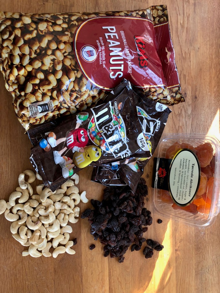 - Peanuts. Fedt som giver en masse energi, men ikke hurtig energi, samt salt til væskebalancen.