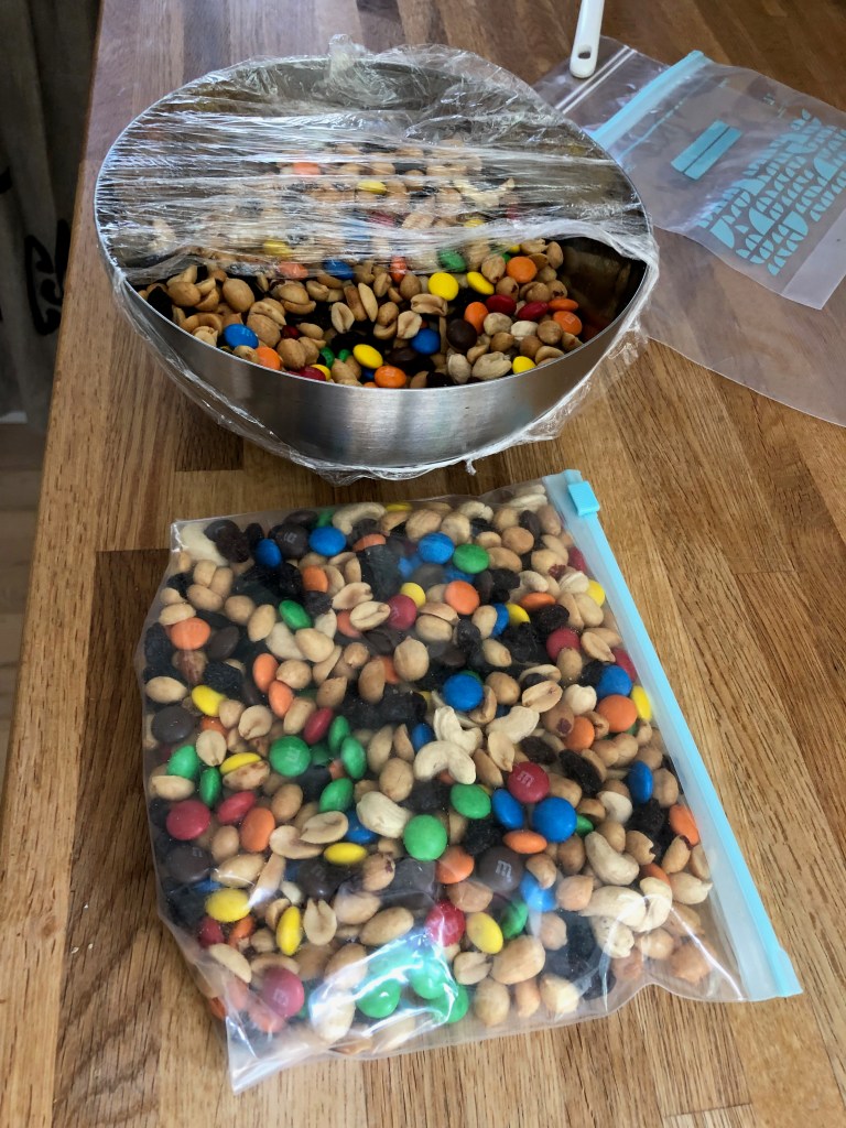 Hele herligheden blandes og puttes i poser med “lynlås”. Denne pose skal være relativ let at komme til under din vandring/cykling. Jeg plejer at smide et plastic kaffemål ned i posen- så jeg ikke tager for meget af gangen. Det er også lidt mere hygiejnisk.