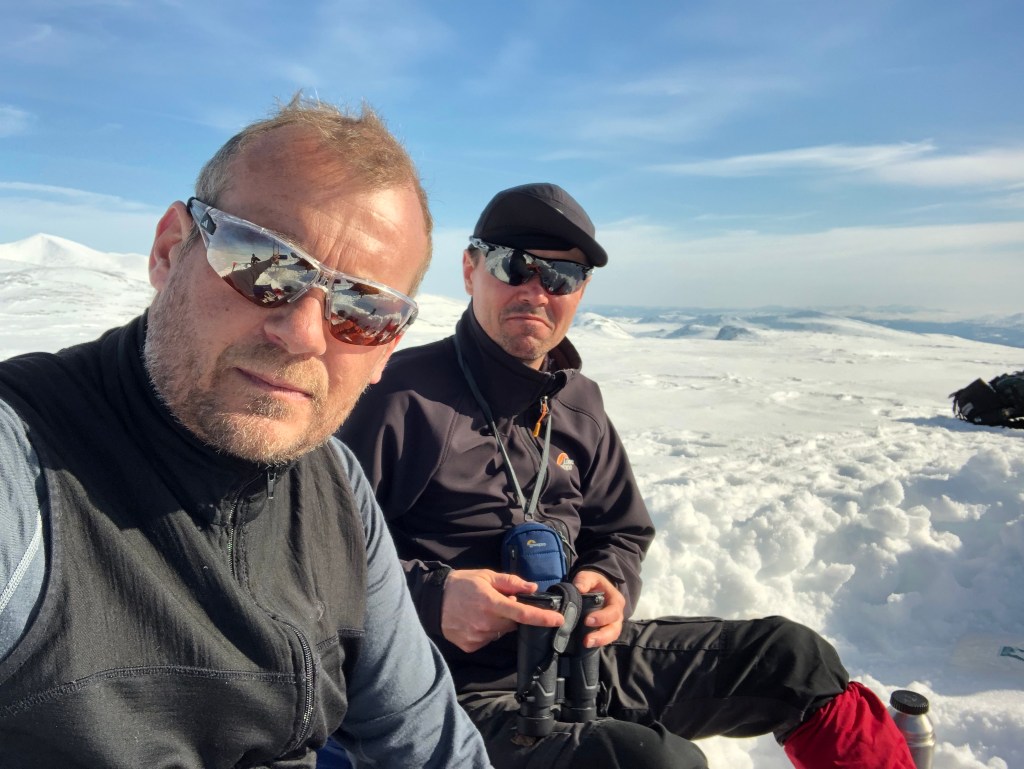 Vi gjorde holdt og spændte pulkene af og placerede dem således som ryglæn. Frem med termoflaskerne og pulvermaden. Frokosten gled ned og Jacob fandt kikkert frem for at finde andre levende væsener i området. Der var helt mennesketomt. Kun fjeld-ryper havde vi forstyrret.
