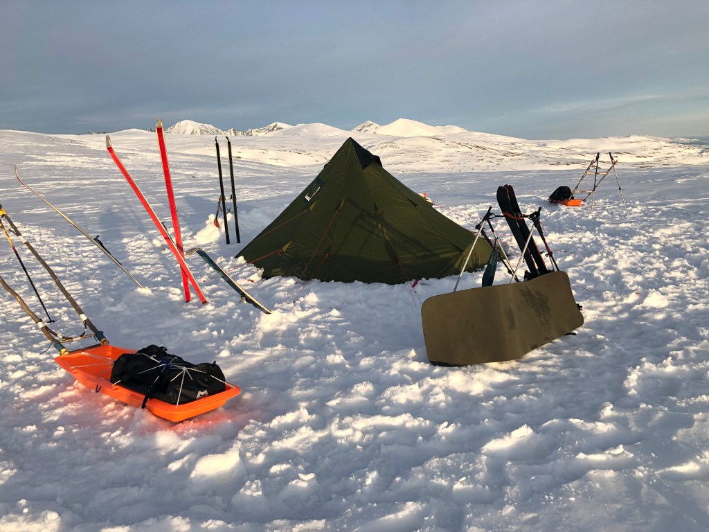 Ved 16 tiden nåede vi Gråhøe. Her besluttede vi at lave en god camp der skulle stå i to dage. Heroppe i 1560 meter var sneen god og på denne position ville vi både have glæde af morgen- og aftensol. Der er naturligvis en pris at betale for den solrige placering: ingen læ for vinden. Et kik på vejrudsigten flyttede ikke vores telt. Vejret skifter hurtigt i fjeldet, det ved alle med lidt erfaring. Teltet er testet under storm og holdt uden problemer. Jeg ejer også tunnel- og kuppeltelt , som preformer bedst i storm. De står virkeligt godt, men der er lav højde i begge typer og med alderen er det rart at kunne tage sit tøj på, halvt stående- frem for halvt liggende! Komfort er i højsædet, sammen med lethed. Teltets midterstang havde jeg udskiftet med en sammenklappelig kulfiberstang. Det sparede mig for 1 kilo. Inderteltet var ligeledes droppet. Sammenlagt var vi dermed under 900 gram pr mand. Som en indskydelse havde jeg taget tre små Harald Nyborg presenninger med, som gulv. Det er trods alt rart at være fri for fugten fra sneen… så plus 3 x 200 gram.