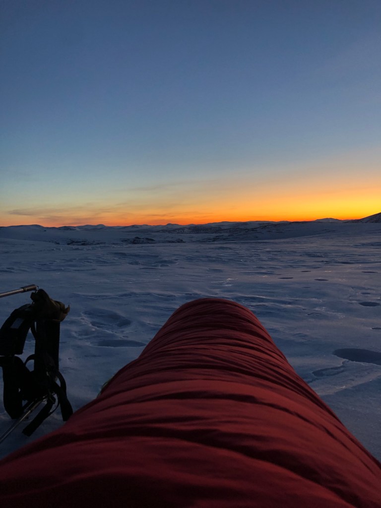 Aftenen meldte sig og ved 20-21 tiden gik vi i poserne. Vejret var helt stille. Ved 3 tiden krøb jeg ud af teltet med sovepose og underlag og fortsatte søvnen ude. Nogen taler om 5 stjernet hotel- jeg taler om 5 billioner stjerners hotel! Sikke en smuk nat og WOOOW for en solopgang! Allerede klokken halv fem begyndte morgenrøden over fjeldet. Jeg tænkte straks på min kone, som sagtens ville kunne klare vinterfjeldet og lovede mig selv at tage hende på vintertur allerede næste vinter. Jeg faldt i søvn igen og vågnede sammen med resten af teamet – ca 12 timer efter vi gik på køjen!
