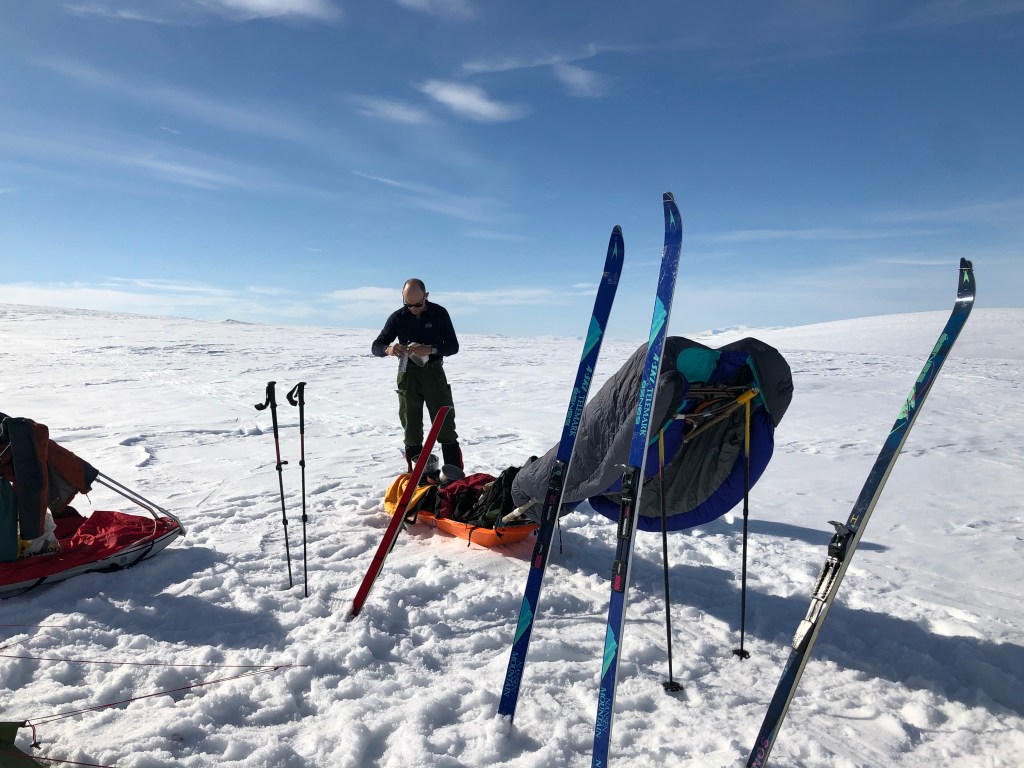 Jeg sad i solen og ventede på Ole og Jacob. Det er med livet som indsats at køre hurtigt på turski, så der gik lidt tid før de kom ned. Frokosten var særligt god i dag, vi havde også knoklet for det. Ole sad og regnede lidt på rutens udfordringer. “Det svarer til, at man bliver bedt om at løbe på ski fra Næstved til Ringsted- men bare uden sne.. gad du det?” Skindene under skien gør, at der ikke er glid.- Så hans betragtning var ikke helt skæv.