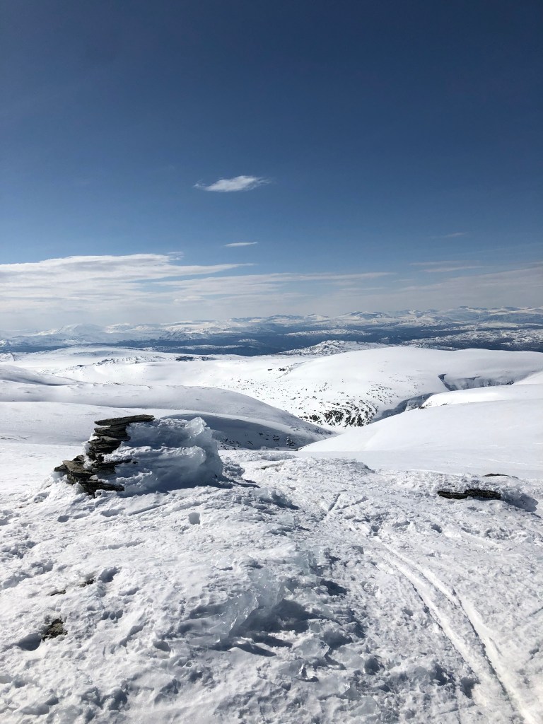 Sveden sprang nu voldsomt fra panden. Jeg havde opgivet planen om at svede minimalt. Derfor kom tempoet op og vi kunne nu følges af, de sidste 400 højdemeter. Jacob understregede sin kropstemperatur og hans blik mod Rusland ved at optræde som en anden Putin: Han tog den sidste opstigning i bar mave. Netop som han smed trøjen tog vinden til. Men det lod Jacob sig ikke notere, stædigt gik han til toppen uden overtøj. Jeg gik allerede og glædede mig over den dunjakke jeg havde i sækken! Vi kom op og Ole proklamerede at han ikke havde tænkt sig at indtage frokosten heroppe. Det var også bidende koldt og enhver sveddråbe blev til en stikkende issyl på huden. Alle tog ekstra tøj på. De klassiske billeder blev fyret af og jeg skiftede til downhill- nu var det nedkørslen mod dalen og en frokost i sol og læ, der talte. Hurtigt aftalte vi mødested- og jeg sagde farveller….