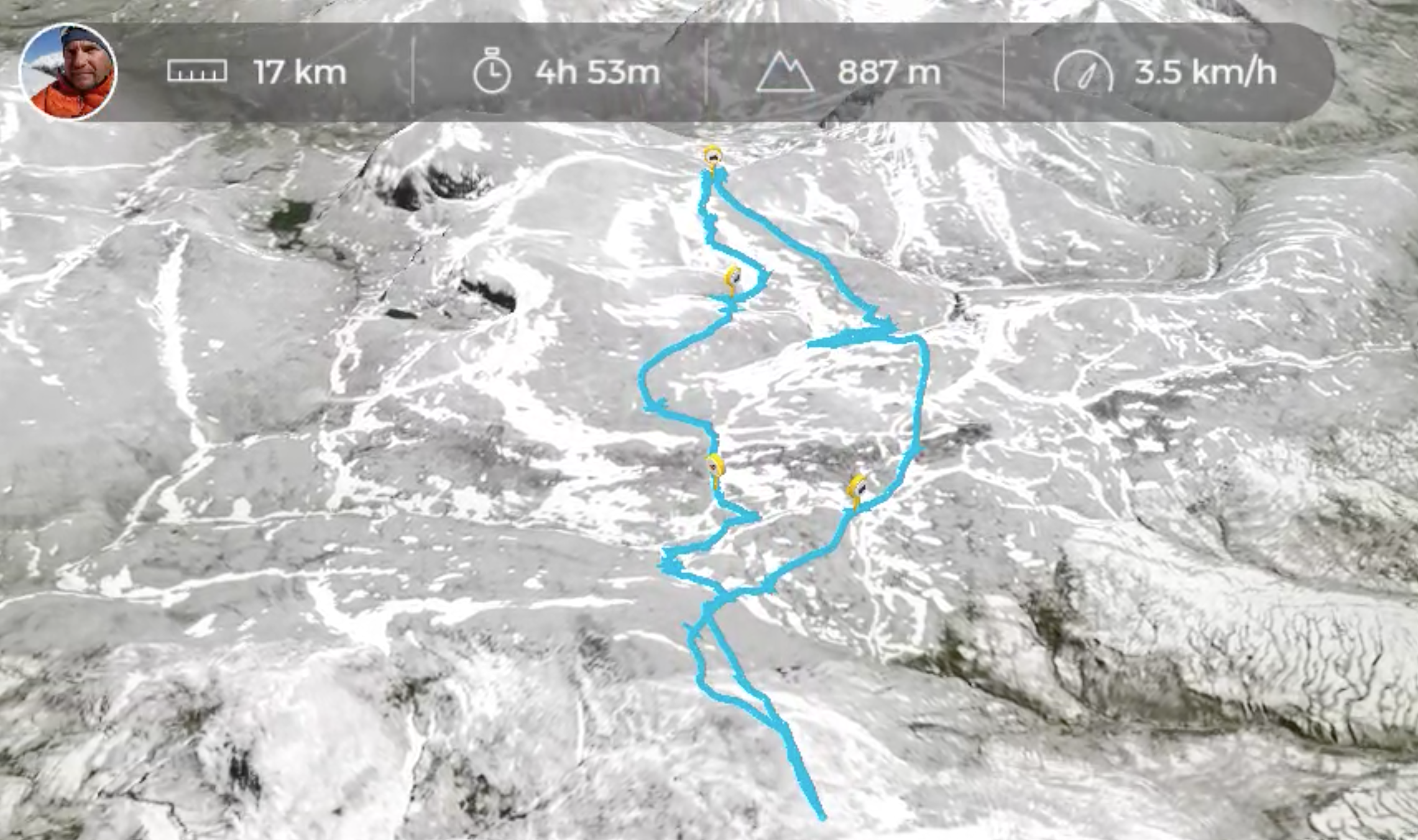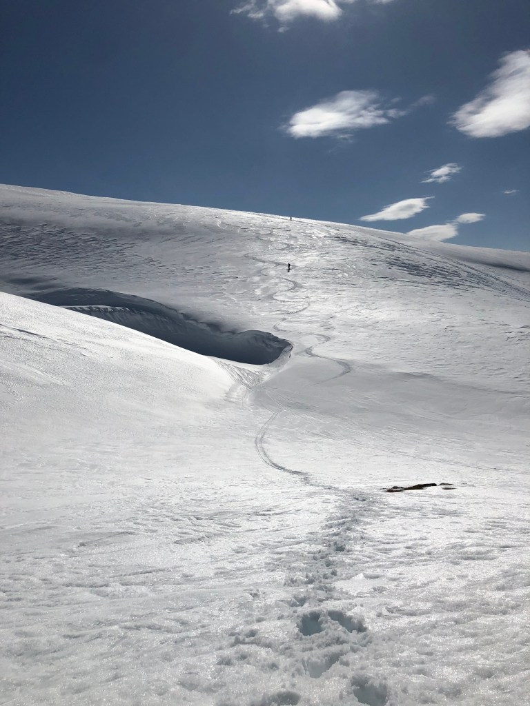 Vi startede med en lille opstigning, ca 100 højdemeter. Herefter kom første dal. Jeg kikkede lidt på Ole og Jacob mens de kørte ned i dalen, med deres klatreskind på. Det gik langsomt men sikkert. Det var dog for stor en fristelse at lade mine ski være i “Walk Mode”- så jeg trak skindene af og låste binding og støvle i “Downhill Mode”. Spidserne mod dalen og afsted. Jacob og Ole stod og sludrede mens de ventede på mig, for kun at opdage at jeg havde ny konfiguration i opsætningen. Jeg buldrede forbi begge og fortsatte nogle 100 meter frem indtil det igen gik opad. Så var det igen på med skind og ændre ski til “Walk”, alt imens de igen overhalede mig. Denne “elastik effekt” viste sig at holde stik flere gange. Men jeg er sikker på, at jeg havde det sjovest!