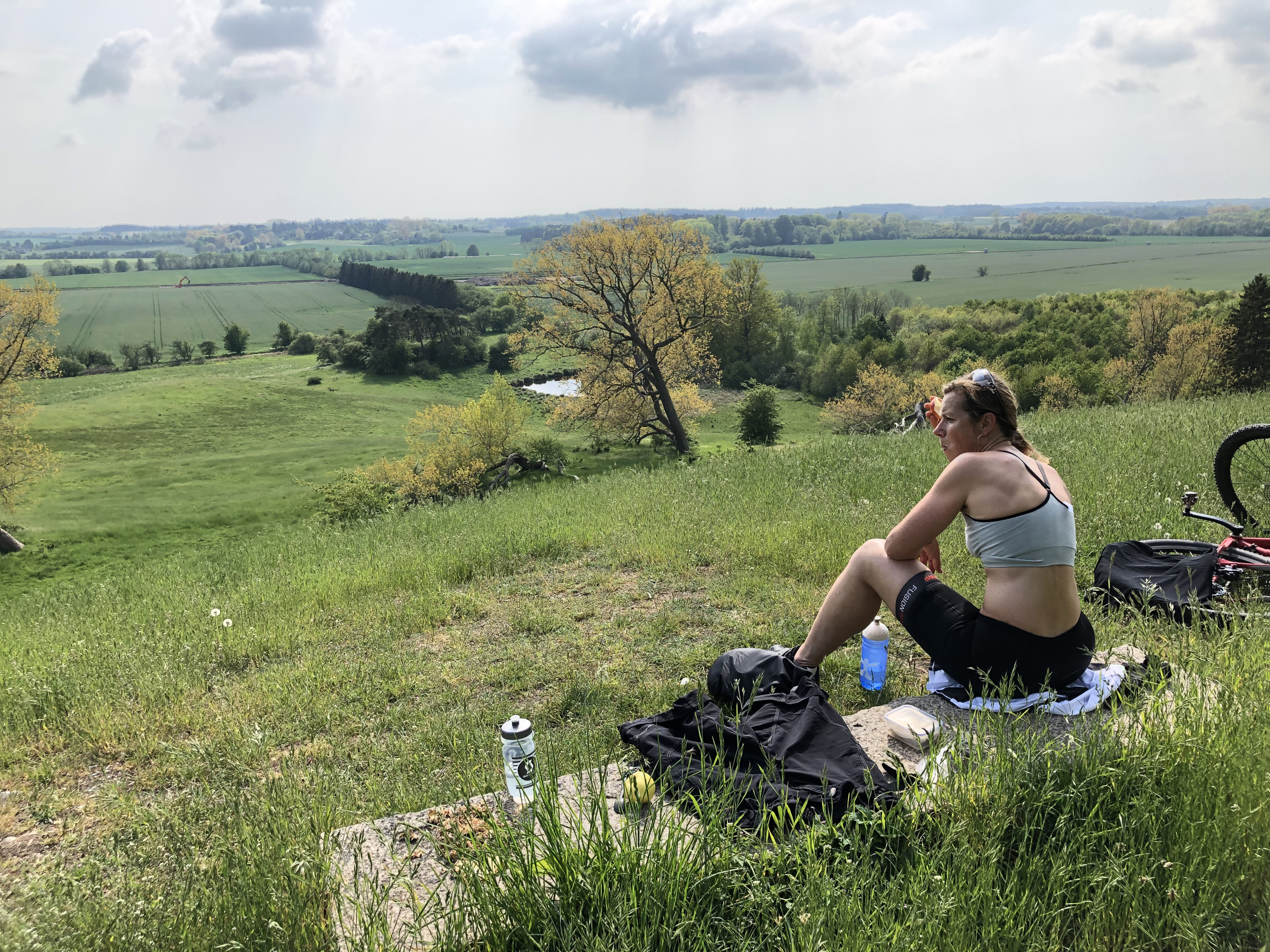 Det gik rigtigt fint. Lyden fra de summende dæk, følelsen af sommer og en saddel der passer fuldstændig til røven, så er det en dejlig dag. Efter en times kørsel ramte vi Fårebakkerne ved Mogenstrup. Her er fine stigninger og en fantastisk udsigt fra toppen. Vi stoppede på toppen som vi plejer. Her var det planen at snuppe en kop kaffe. Heroppe var solen lige på og det var helt vindstille. Sveden dryppede og varm kaffe måtte vige for koldt vand og et æble.
