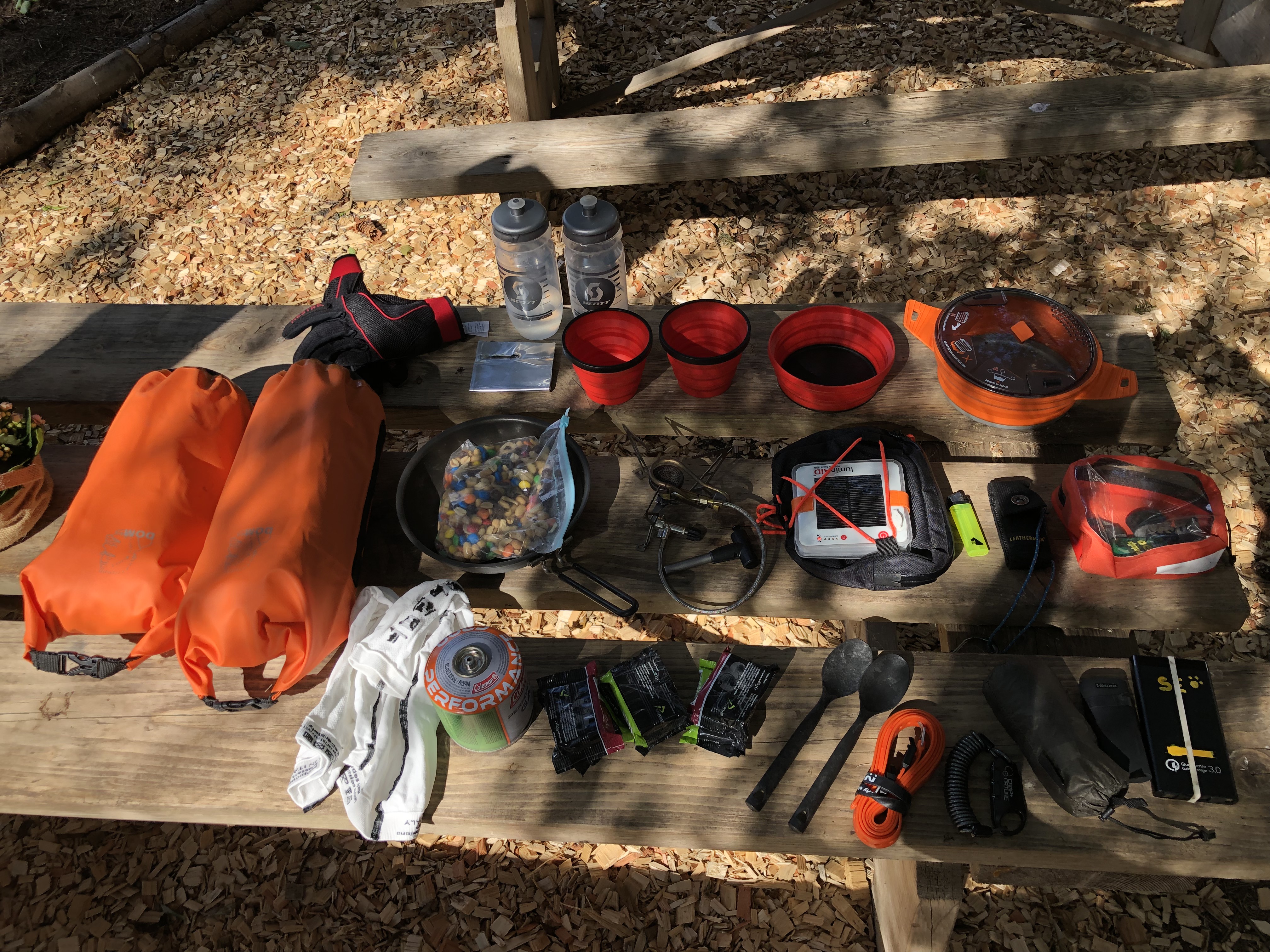 I øvrigt er alle tasker vandtætte, således at regn ikke er en hindring. Jeg pakker således at f.eks telt, tarp og andre ting der næsten altid bliver våde, er pakket i vandtætte poser/tasker- og helt for sig selv. Det er ikke smart at pakke en våd regnjakke sammen med dit skiftetøj!