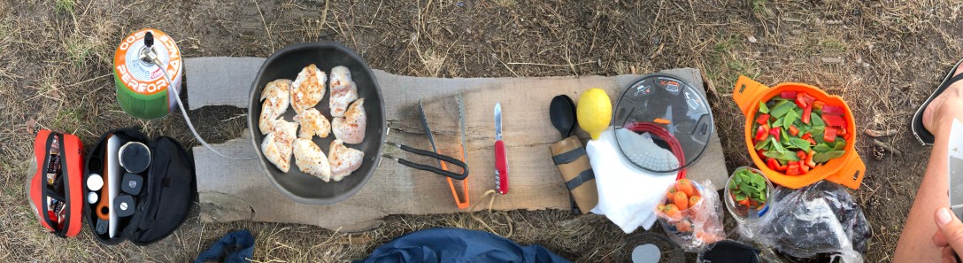 Vi medbringer et lille kogesæt som er komponeret ud fra forskellige mærker. GSI laver et godt lille køkkensalt med det værktøj du har brug for. Dertil har jeg ilagt en lommekniv med proptrækker og dåseåbner. Der er også plads til to små salt/peber kværne. Vi har en pande med, som er uundværlig! Den er også fra GSI, lille, let men effektiv. Gryde som kan klappes sammen, samt kopper og madskål fra Sea to Summit. Brænderen er fra Primus, pillet ud af et sæt. Den kører på gas og er uhyggelig effektiv og let. Dog et lille minus… skruekobling er ikke så udbredt i Tyskland. Dog findes dåserne i byggemarkeder.