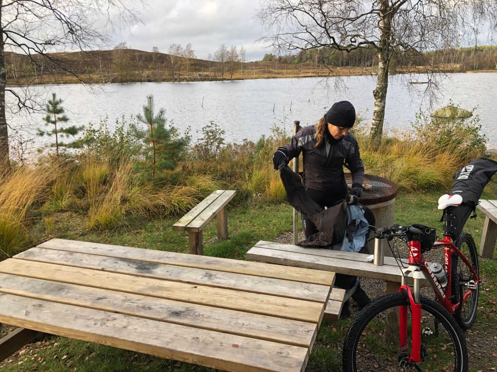 Det er ikke altid at sporet på en vandrings-led, er til at cykle. Heldigvis kan man da trække sin cykel igennem det meste. Vi knoklede på i små 30 minutter uden at komme i sadlen. Som så ofte før, skifter sporet ofte karakter og pludselig var det igen kørebart. Vi kørte til en lille shelterplads ved Björnsjöen, Mästocka. Her blev det tid til kaffe og en lille sundheds snack, hjemmelavet naturligvis.