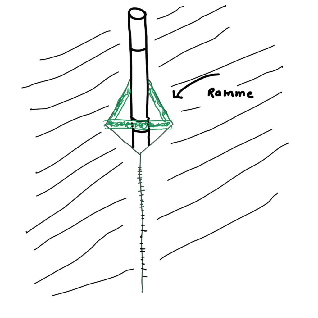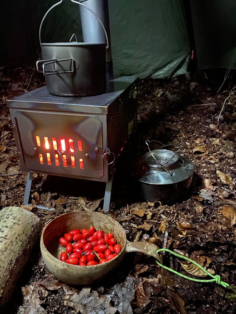 Etableringen af lejren gik relativt hurtigt. Først telt, så brænde, dernæst samling af ovnen. Ovnen vejer 1500-1800 gram inkl skorsten og fylder ikke mere, end den kunne være i rygsækken sammen med resten af udstyret. Ovnen er en “klap ud” sag som er samlet på 2 minutter. Skorstenen er lige så let at håndtere, specielt efter første brug. Den skal lige brændes til- så er det som om at den har “hukommelse” når den igen rulles ud. Men første gang er det en god ide at få nogle hjælpende hænder og husk handsker- for det er ultra tyndt metal der let skærer igennem huden. Mens jeg indrettede teltet og ovnens placering- kom jeg i tanke om, at jeg lige skulle lave en lille trekantet ramme til skorstenen- for den bliver varm og smelter let den tynde teltdug. Rammen snittes let af tre grene som danner en trekant. Trekanten sættes omkring skorstenen holder afstand til teltdugen- mit telt har ikke et hul til skorstenen (endnu. Så jeg bruger indgangen og lyner ned fra oven- indtil skorstenen kan komme ud og derefter tilpasses åbningen til træ-rammen.