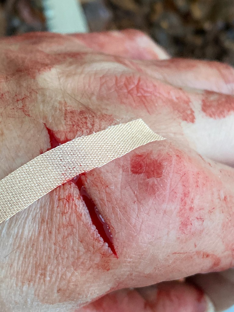 Jeg sover godt igennem fra midnat til kl 7. Jeg havde valgt at putte hånden i en handske for at modvirke tryk. Desværre er blødningen fortsat en smule og handsken er “groet fast” i forbindingen. Jeg kan godt fornemme at det trækker lidt i såret da handsken skal af. Min kone ringer og oplyser at min stivkrampe er udløbet for minimum ti år siden… ! Vi aftaler at jeg går hjem og når hun kommer retur fra job- tager vi et smut på skadestuen og får styr på stivkrampevaccination og evt sutur.