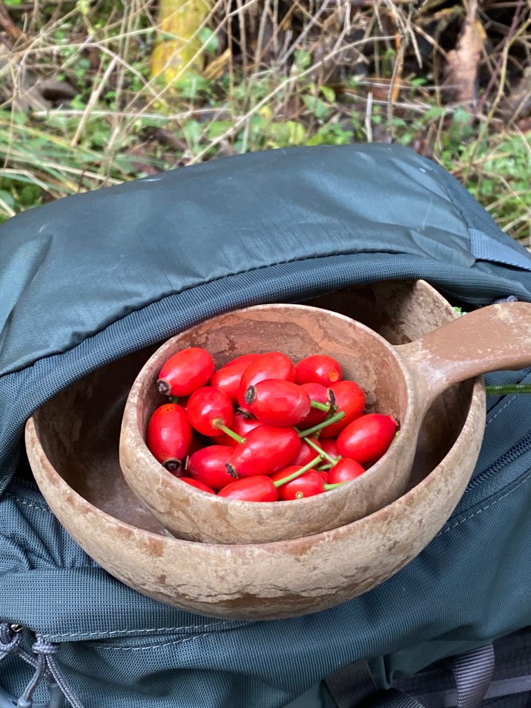 Jeg havde pakket rygsækken med udstyr i bedste kvalitet og ikke for meget vægt. En titaniumsovn med skorsten. Sovepose, økse, sav, kniv, telt, underlag, titaniumsgryde, bestik, mugg, kedel, vandfilter, førstehjælpssager og min elskede Fjell-duken. Igen blev jeg glad over at glide med i mine 8-10 år gamle vandrestøvler. Det er lidt som at fødderne møder en velkendt og trofast makker. Støvlerne er Lundhags svar på den perfekte støvle til fjeld og jagt. Den sidder perfekt på mine fødder- men først efter de er gået til. Resten af min påklædning bar også præg af min hang til jagt… eller at være uset i skoven. Så alt i dæmpede farver – med en forbedret chance for at se flere dyr. Toplommen på rygsækken indeholdt kun skål og kop- meningen var at samle mad undervejs, som skulle udgøre min mad på turen.