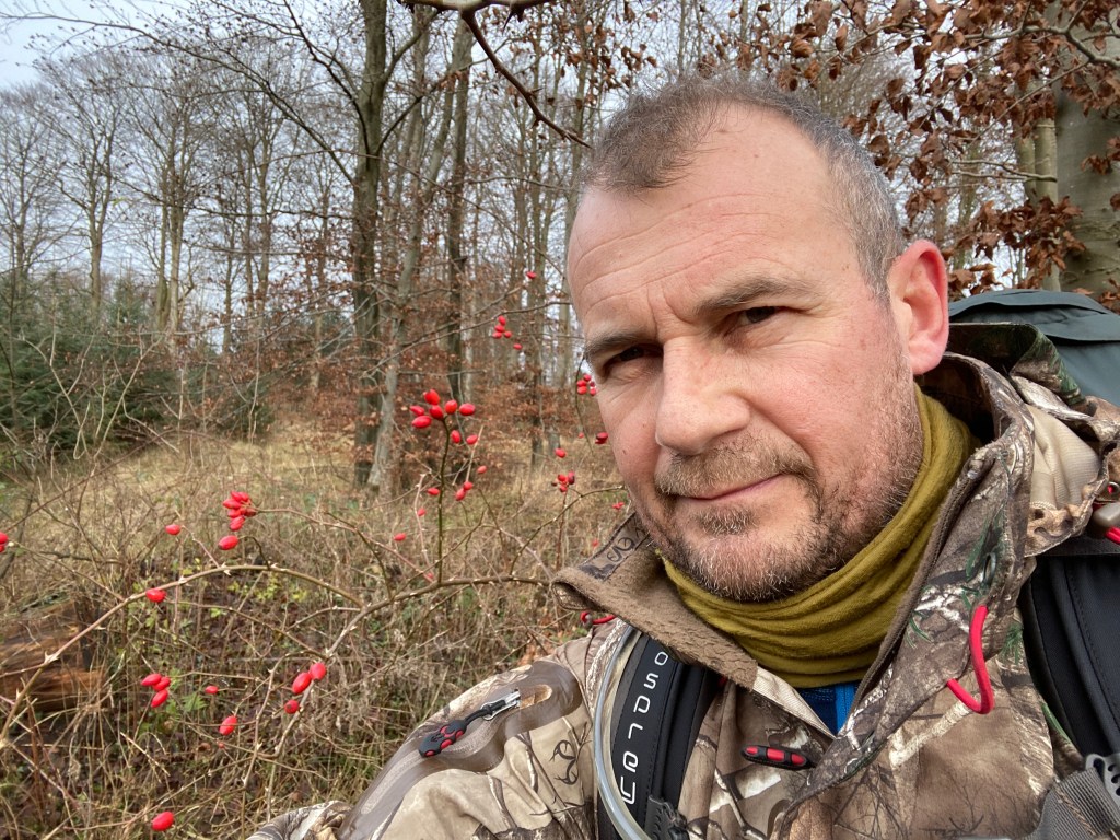 Jeg tog afsked med min kone og gik fra hjemmet. Efter en times vandring gjorde jeg et holdt og plukkede lidt hyben og hev nogle dunhammer rødder op. De friske og hvide rødder smager lidt af asparges. De kan spises rå- men med fordel koges, så man ikke bruger for meget energi på at optage energien. Jeg gik videre endnu et par timer og klokken nærmede sig 15. Jeg fandt et vandløb der udelukkende løb i skoven og videre ud i en mose- så frem med mit MSR Hyperflow filter. Hurtigt pumpede jeg 4 liter vand direkte ned i vandblæren og straks efter begyndte jeg at lede efter et egnet sted til nattens camp.