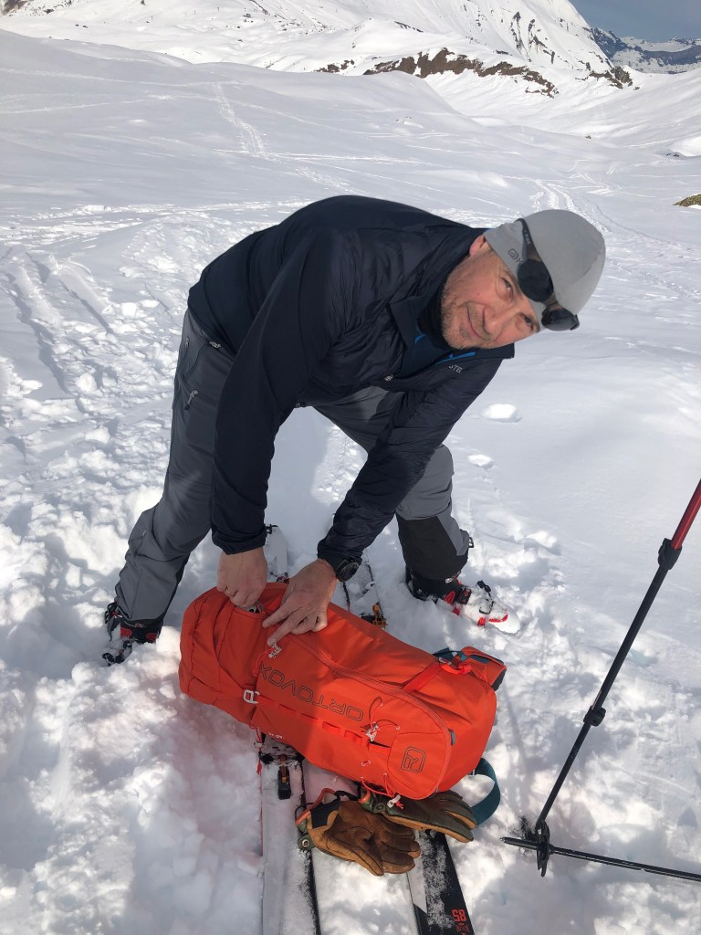 Solen skinnede fra en skyfri himmel da vi endelig kom ud af hytten. Vi havde pakket sneskovl, søgestang og sat den elektroniske lavinesøger på plads i bukselommen og lukket lommen forsvarligt til. Der er stadig få der placerer lavinesøgeren i toplommen af deres oppakning. Men det er sket at rygsækken er revet af manden i en lavine, men mig bekendt har ingen der er gravet ud af en lavine, manglet sine bukser!