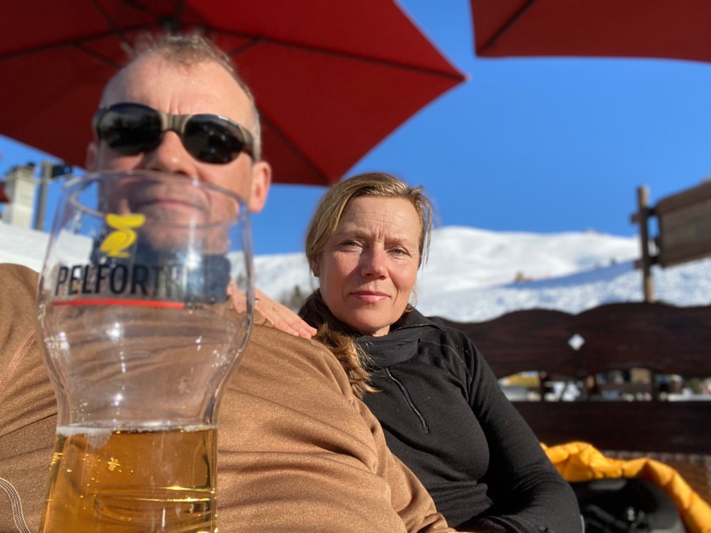 Straks ved ankomst til skiområdet, krævede vores anstrengelser en belønning. Med solstol og en fadøl blev oplevelsen fejret- dvs min hustru skulle have en kop kaffe og en gulerod?