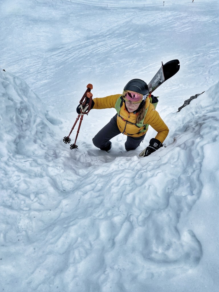 Vi klargjorde ski med skind og spændte dem på rygsækken. Det første stykke stod på let klatring uden behov for yderligere sikkerhed andet end ekstra opmærksomhed. Jeg gik/klatrede forrest og sparkede trin ind i sneen. Vi kom hurtigt op og kunne bevæge os hurtigt på bjergkarmen. Den var ikke så skarp og voldsom og flere steder var der en 2 meter bred “vej” at gå på. Samtidig med arbejdet begyndte varmen for alvor at skabe en del dug på køleren. Jeg har altid en intension om ikke at svede voldsomt under vinteraktivitet, men her i solen var det umuligt.