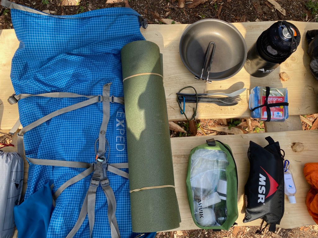 Alle herlighederne skal i en rygsæk, jeg har valgt en rygsæk med god bærekomfort og en genevægt omkring 1050 g. Jeg har også tagen et celleplast ligge/sidde-underlag med (1/2 størrelse). Det er luksus men bare skønt at have med ude ved bålet- og det vejer kun 150 gram- men skulle der smutte en glød eller en torn i underlaget sker der ikke noget videre. Det er derimod meget uheldigt for dit oppustelige underlag.