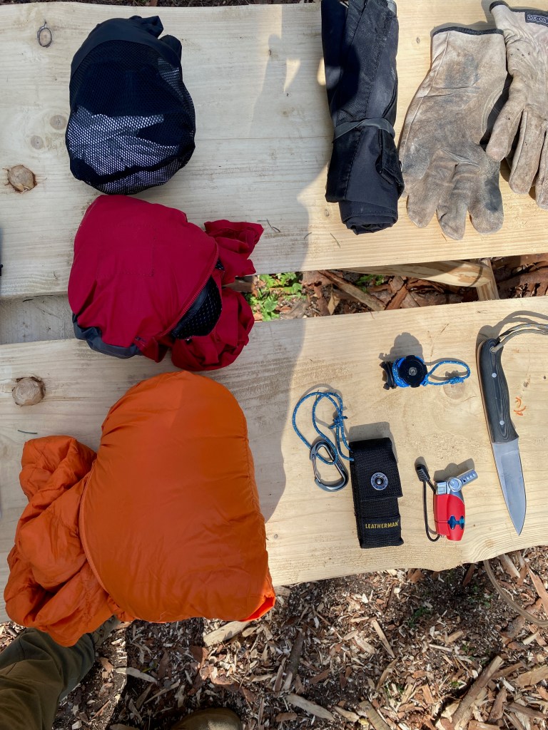 På vandreture har jeg næsten altid Gaiters (205 g) på. På den måde skåner jeg mine bukser når ruten går igennem vådt græs, mine fødder holder sig tørre og dermed mindre risiko for vabler. Endelig er der ikke fri adgang for flåter. Et par læderhandsker (145 g) har jeg også med. Gerne nogen i kalve eller gedeskind som sidder lidt tæt. Jeg skåner mine hænder for mange rifter, torne og små sår- som helt sikkert kommer ude i felten. I forbindelse med bål-arbejde er de guld værd. Hue og halsedisse (150 g) ligger altid øverst i rygsækken. Jeg er fan af uld, som varmer selvom det er lidt fugtigt- modsat bomuld. Uld lugter ikke trods flere dages brug- så længe du er flink til at flufte det. En god kniv (220 g) og et multitool (210 g) hører altid med i mine pakkelister. Jeg har også en lighter (75 g) med, gerne i en god kvalitet og eventuelt et ildstål (75 g). Den lille dims ved siden af kniven er en Quadlock mobilholder. Den er beregnet til at holde mobilen på et cykelstyr, men kan også sættes på pind eller teltstang. Så kan du se lidt film uden at holde mobilen i hånden og konstant tabe den ned i ansigtet (et lille sår på næseryggen er ofte resultatet af en tabt mobil… ) 🙂