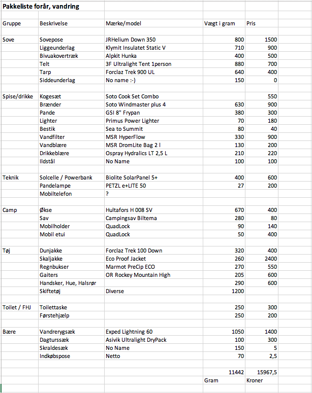 Forudsætningerne for denne pakkeliste er: En vandretur over flere dage i foråret. Dvs jeg kan forvente solskin, blæsevejr, nattefrost og regn. Jeg ønsker ikke at slæbe mig ihjel, men vil gerne kunne holde et jævnt tempo og have mulighed for både overliggerdage med bål og hygge. Samtidig ønsker jeg en smule komfort- så det bliver ikke en skrabet pakkeliste. Men jeg holder mig omkring 10 kilo i sækken.
