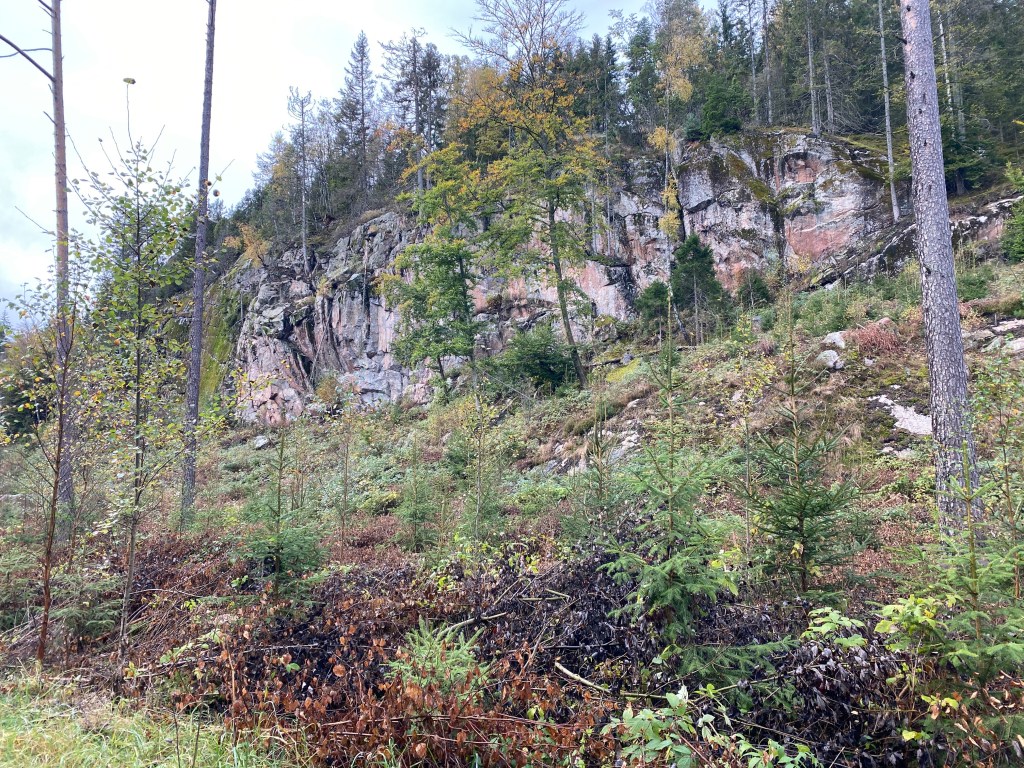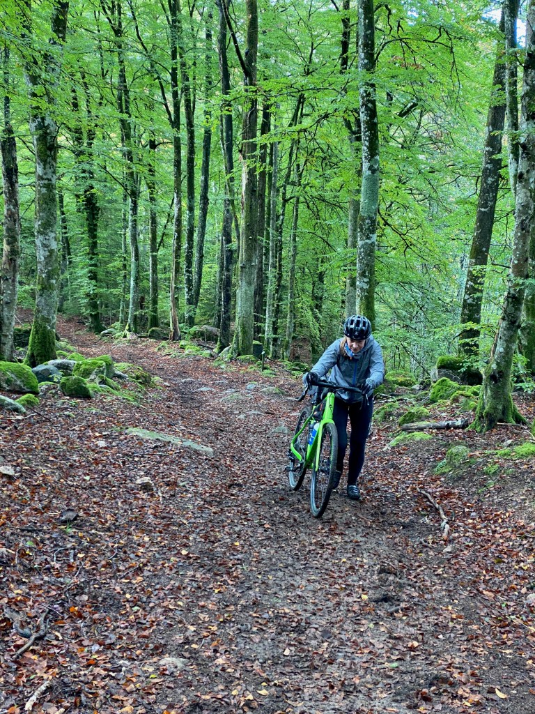 En stigning var beklædt med store granitskærver som lå meget løse. Det var ikke muligt at cykle op af den- ikke for os i hvert tilfælde. Så der måtte vi af cyklen og trampe op. Selvom MTB sko er født med grov sål, er den overhovedet ikke egnet til at gå på granit klippe. Sålen er stiv og hård og konstant gled vi på de våde granitskærver. Op kom vi og næste stigning var ganske imponerende og meget stejl. Den var til at cykle på, men vi måtte begge lige snuppe en drikkepause- bakken var længere end forudset. Jeg havde lagt hårdt ud og forventede at bakken stoppede lige deroppe- ca 450 meter fremme. Men det gjorde den ikke! Det var blot den første 1/3 del… Metalsmag i munden og to lunger der ikke kunne levere nok ilt til lårbasserne. Mens jeg lige ventede på fruen prøvede jeg at finde en passende kommentar, men hun fortsatte forbi mig! Heldigvis stoppede hun 10 meter længere fremme og jeg kravlede op til hende. Vi stod der og kikkede op mod toppen og blev enige om at det alligevel var den stejleste bakke vi endnu havde kørt på gravelbike- eller havde forsøgt… Pulsen kom ned i mere tåleligt tempo og denne gang var mit udlæg mere behersket. Jeg havde ikke en plan om at stoppe i dette forsøg.