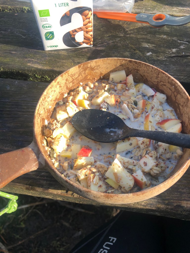 Ved 9 tiden var vi klar til at tilberede morgenmaden. Hjemmefra havde vi pakket müsil i poser og så var det også lidt pandekagedej tilbage.