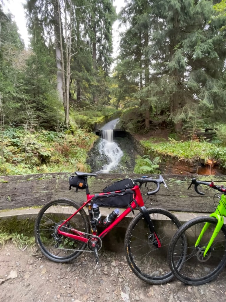 Næste morgen gjorde vi klar til den første Graveltur. Cyklerne blev pakket med lidt ekstra tøj, et par powerbars samt vand og det nødvendige værktøj/lappegrej og en ekstra slange. I de seneste dage havde jeg været en enkelt dag til tælling med feber, snot og hosteri. Jeg gik fortsat og hakkede noget, men feberen var væk og motivationen var høj- så jeg glædede mig til at rulle ud på ruten. En opvarmningstur på 50 km kunne vel ikke være så slem. Vejret var stadig køligt og overskyet. Flere skyer hang i skovende som fugtige dyner der ikke lod sit tag slippe. Vi kunne straks mærke hvorledes vanddråber samlede sig i ansigtet, først fugtigt derefter som små bække der løb ned over ansigtet. Straks fik jeg tanken, at jeg måske ikke havde tøj nok på, for fugten hev meget varme væk fra kroppen. Ruten startede med en vild nedkørsel, men som ofte afløses enhver nedkørsel af en lige så vild opkørsel!