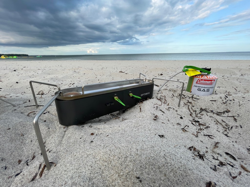 Min foldbare Titaniumsovn og et hottent fra OneTigris (telt med skorstensgennemførsel) blev pakket ned i traileren sammen med økse og sav. På den måde kunne jeg i hverttilfælde holde varmen og tørre tøj, skulle det blive nødvendigt. Et godt liggeunderlag og en Quilt fandt vej i traileren, samt en Urberg feltseng og en Asivik klapstol. Dobbeltbrænder fra Optimus samt diverse kogegrej….. og min GSI kaffekværn med tilhørende stempelkande, jo luksus skulle der være. Brænderen er i en klasse for sig, den leverer 2×3000 watt og håndterer to gryder og hvert blus reguleres trinvist. Kun 820 gram for et dobbeltblus er verdensklasse.