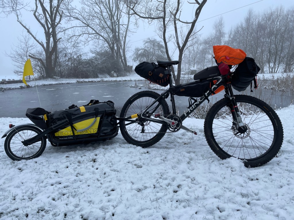 Allerede et par dage inden, begyndte jeg at finde diverse udstyr frem. Min trofaste MTB blev udstyret med anden stikaksel, således at traileren kunne påsættes. Derudover skiftede jeg fra klikpedaler til flats. Jeg havde ikke lyst til at fryse for meget om fusserne og gad heller ikke at bedbringe ekstra vinterstøvler. Med flats monteret kunne jeg bruge almindelige vinterstøvler. Jeg smed også Pogies på styret- en vel foret vinter handske der sidder på styret. Jeg kunne således have tynde vanter på og alligevel have det dejligt varmt på fingerne.
