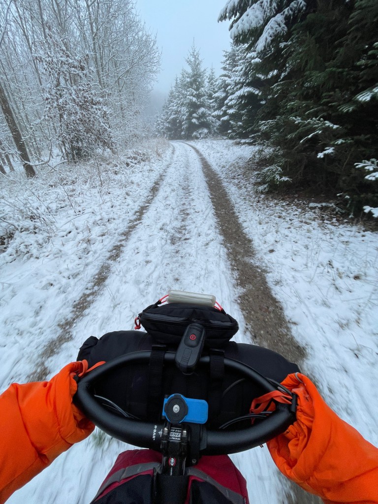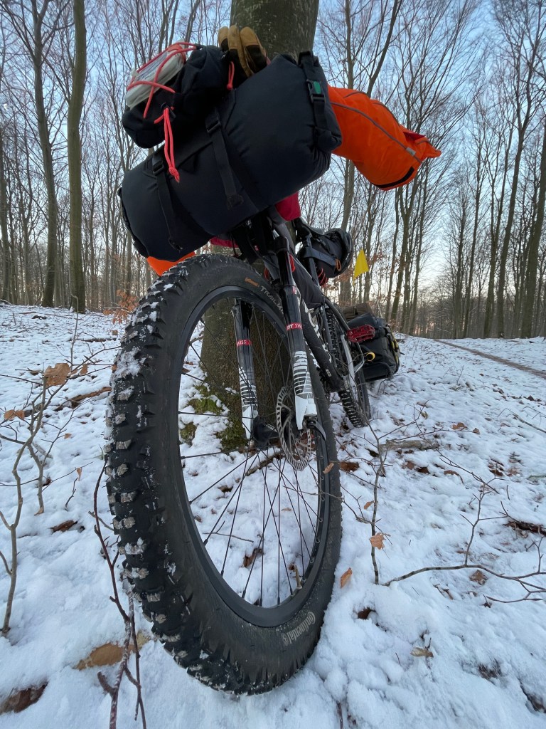 Hustruen blev kysset farvel og straks kunne jeg tydeligt mærke, at traileren var pakket tungt. Nuvel, jeg skulle jo ikke cykle flere hundrede kilometer, men jeg vidste allerede at det ville blive temmeligt anstrengende. Jeg skulle blot krydse vejen for at fange de første skovveje. Allerede nu strømmede glæden frem. De grove dæk summede behageligt og sneen knirkede under trykket fra cyklen.