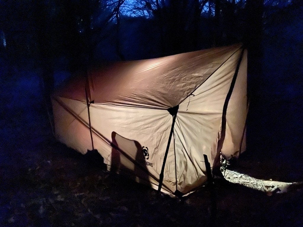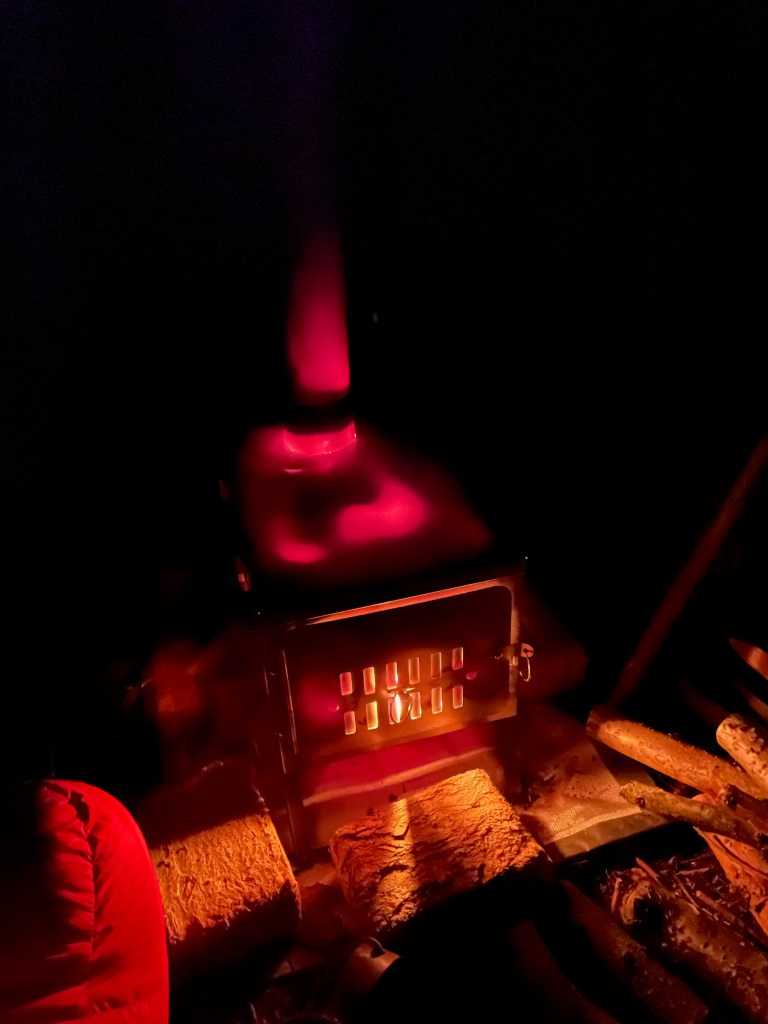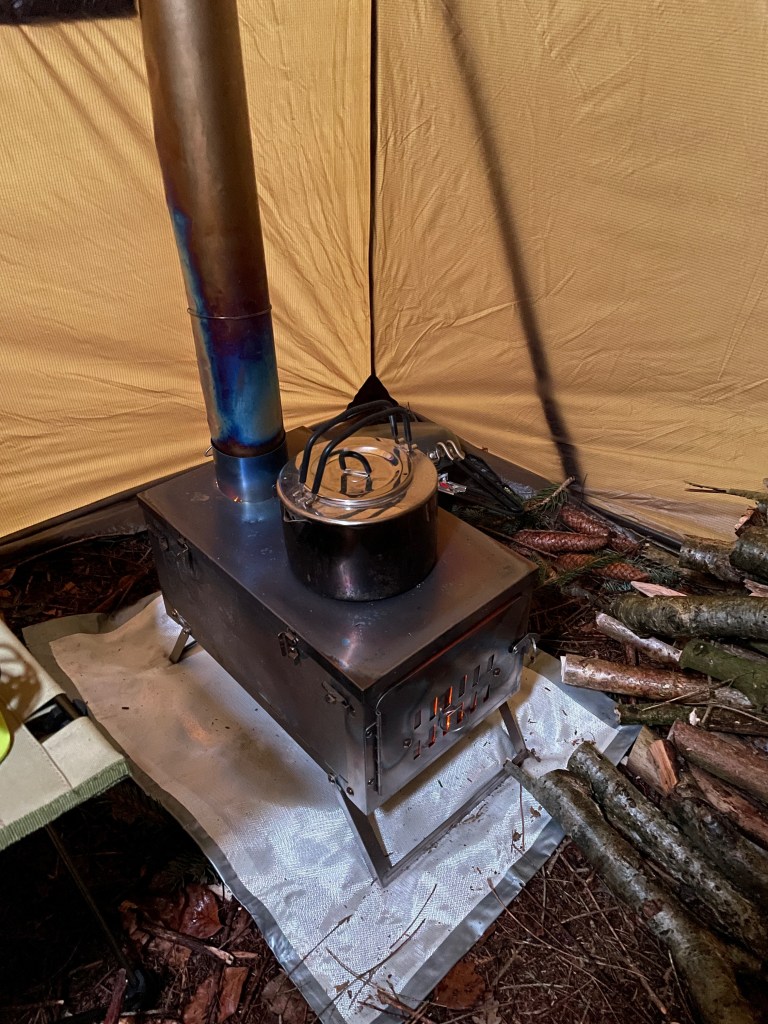 Uldundertrøjen som var godt fugtig efter cyklingen blev skiftet ud med en tør og jeg gik i gang med at samle, save og hugge brænde. Teltet blev opsat mellem to træer. Egentlig er teltet lavet til hængekøje, men det fungerer også fint til 4 personer. Da jeg kun var mig, blev der plads til både cykel og trailer- og med et areal på 2×3,8 meter (og næsten stå højde) var der rigelig plads. Feltseng, stol og et klapbord udgjorde hjemmet sammen med brændeovnen. Tørresnor og lampe kom på plads og efter få minutter kom der også fart på brændeovnen.