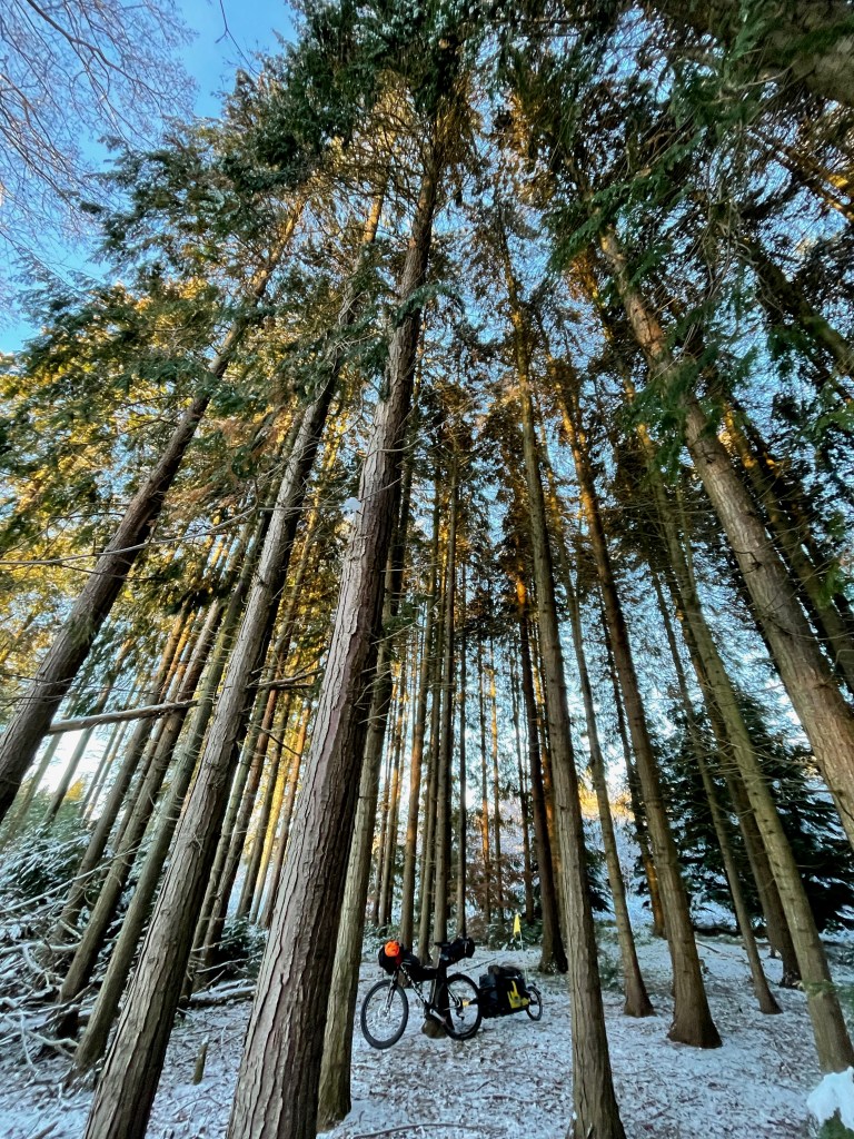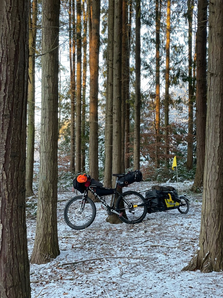 Jeg vågnede tidligt. 05.45 lige som jeg plejer. Nu var det tydeligt koldt og der hang en del is på indersiden af teltet. Jeg havde forberedt optænding af ovnen og gik straks i gang. Efter 30 minutter var teltet igen tørt. Jeg drak kaffe og gik i gang med at pakke. Det var dejligt at kunne pakke i god ro og under varme forhold. Jeg ventede til slut med at tage ovnen ud og pakke teltet sammen. Denne morgen var rigtig flot og jeg kunne trille fra lejren allerede kl 8. Jeg var naturligvis sulten, men så snart kroppen begynder at arbejde, forsvant tanken og følelsen. Nu trampede jeg igen i pedalerne og kursen var sat mod næste udvalgte skov. Jeg havde mine aftaler på plads omkring campering, så jeg vidste præcist hvor næste lejr skulle være. En plads med en lille bæk og med mulighed for sol hele dagen. Igen kom der lidt underholdning i det ene øre og tiden fløj afsted, mens jeg på ingen måde kan sige at cyklen også fløj. Tempoet var ganske afslappet…