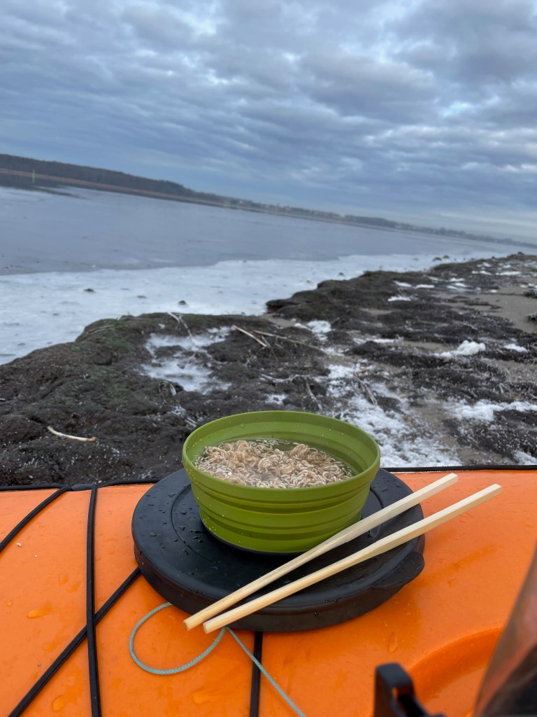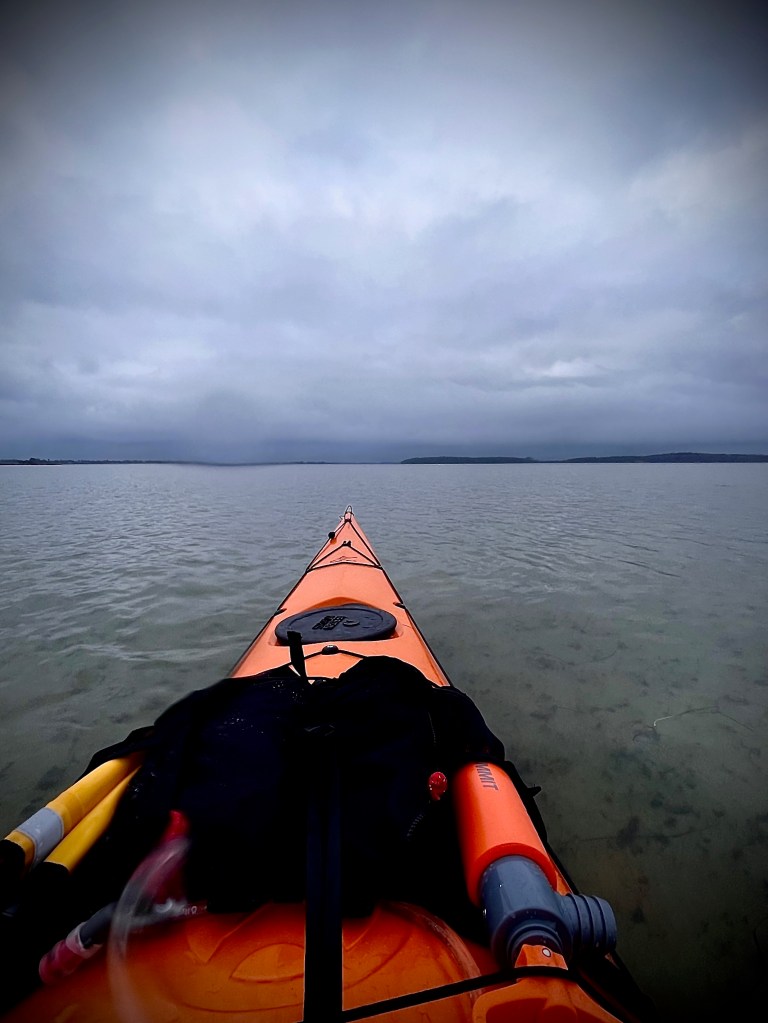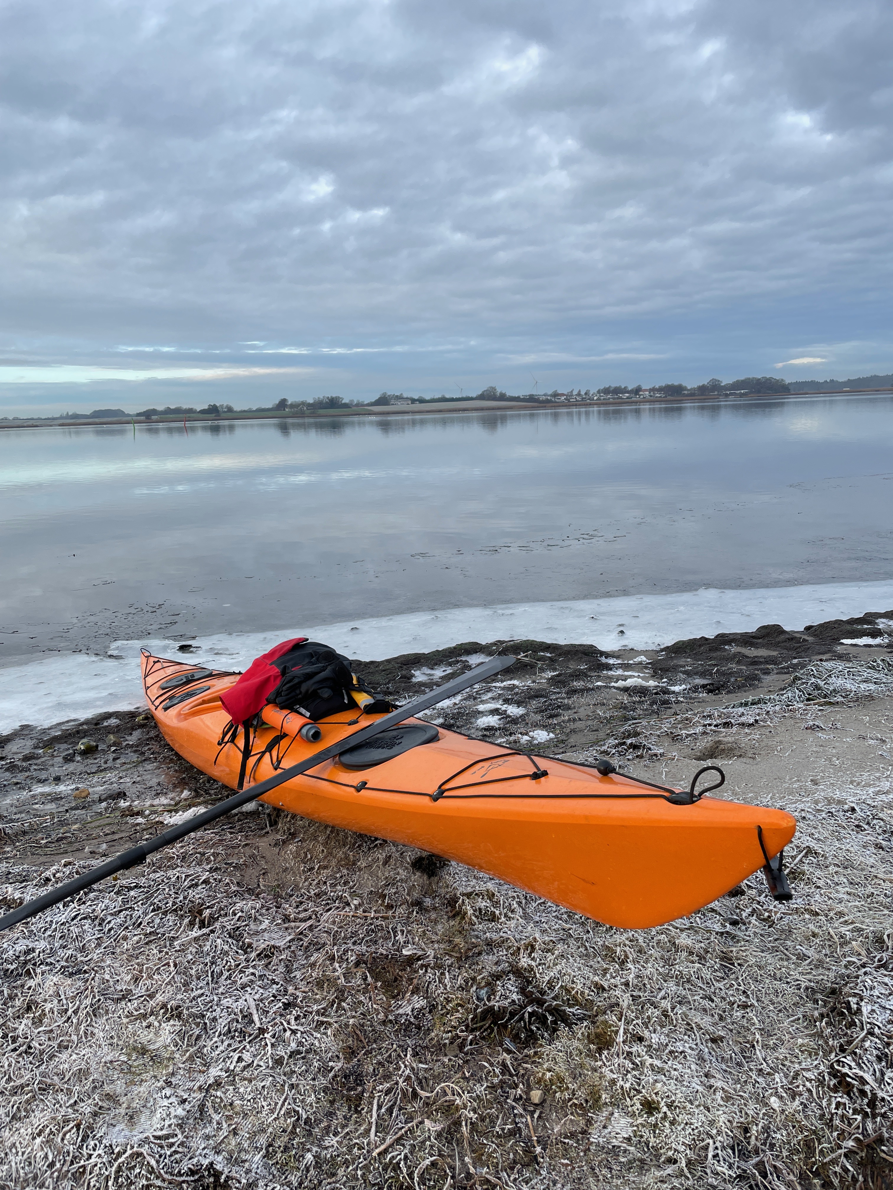 Minutnudlerne kom i truget og varmt vand fra termokanden overhældt. Mens jeg stod og ventede kunne jeg se hvorledes skyerne trak frem på himlen. Det var smukt, men det varslede også regn/slud. Med kikkerten forsøgte jeg at spotte en isfri rute retur til kanalen. Det så ud til at være fint langs modsatte kyst. Jeg ringede hjem for at annoncere at alt var vel og at jeg var på vej hjemover. Efter en kop kaffe smed jeg en podcast i øret og trak kajakken ud i vandet. Lidt puslen med spraydeck og jeg var klar. Det var en dejlig tur tæt op under kysten og jeg fik virkelig brugt “kantning” når kajakken skulle styres. Jeg har ikke ror på, men en finne der kan bruges til at holde retning. Finnen blev trukket op og nu var det primært hoften der stod for styring. En fantastisk hjemtur hvor der gik ren leg i systemet.