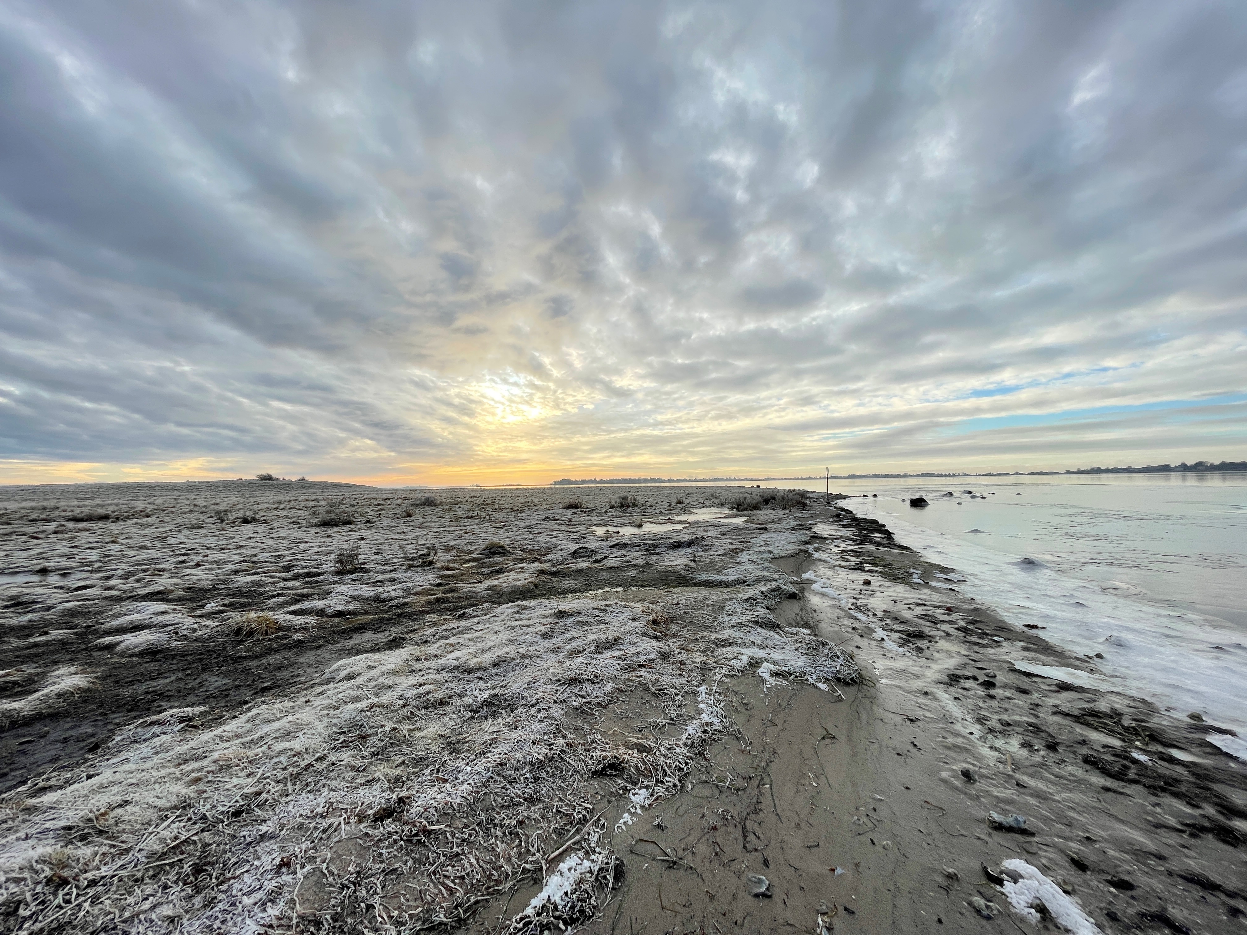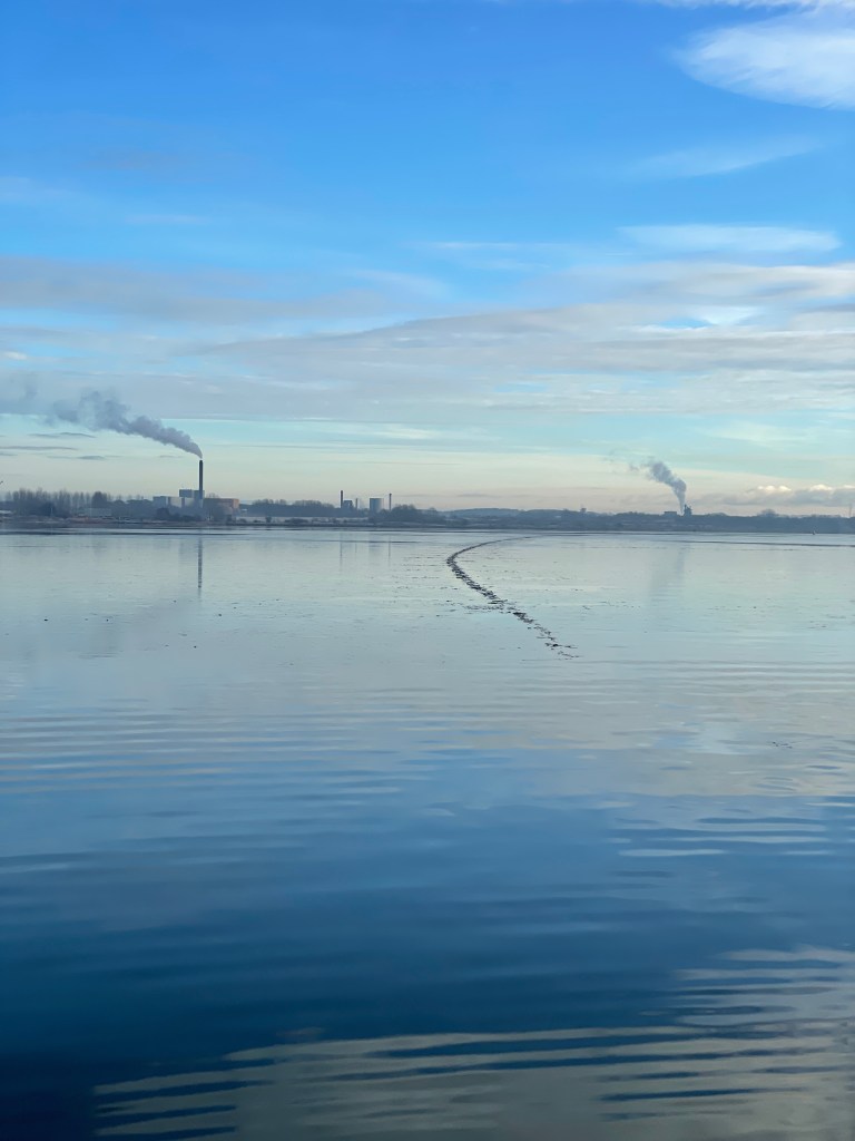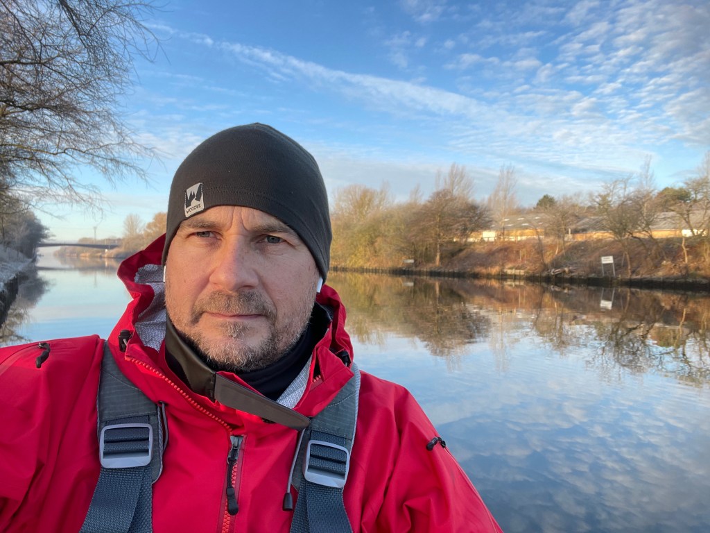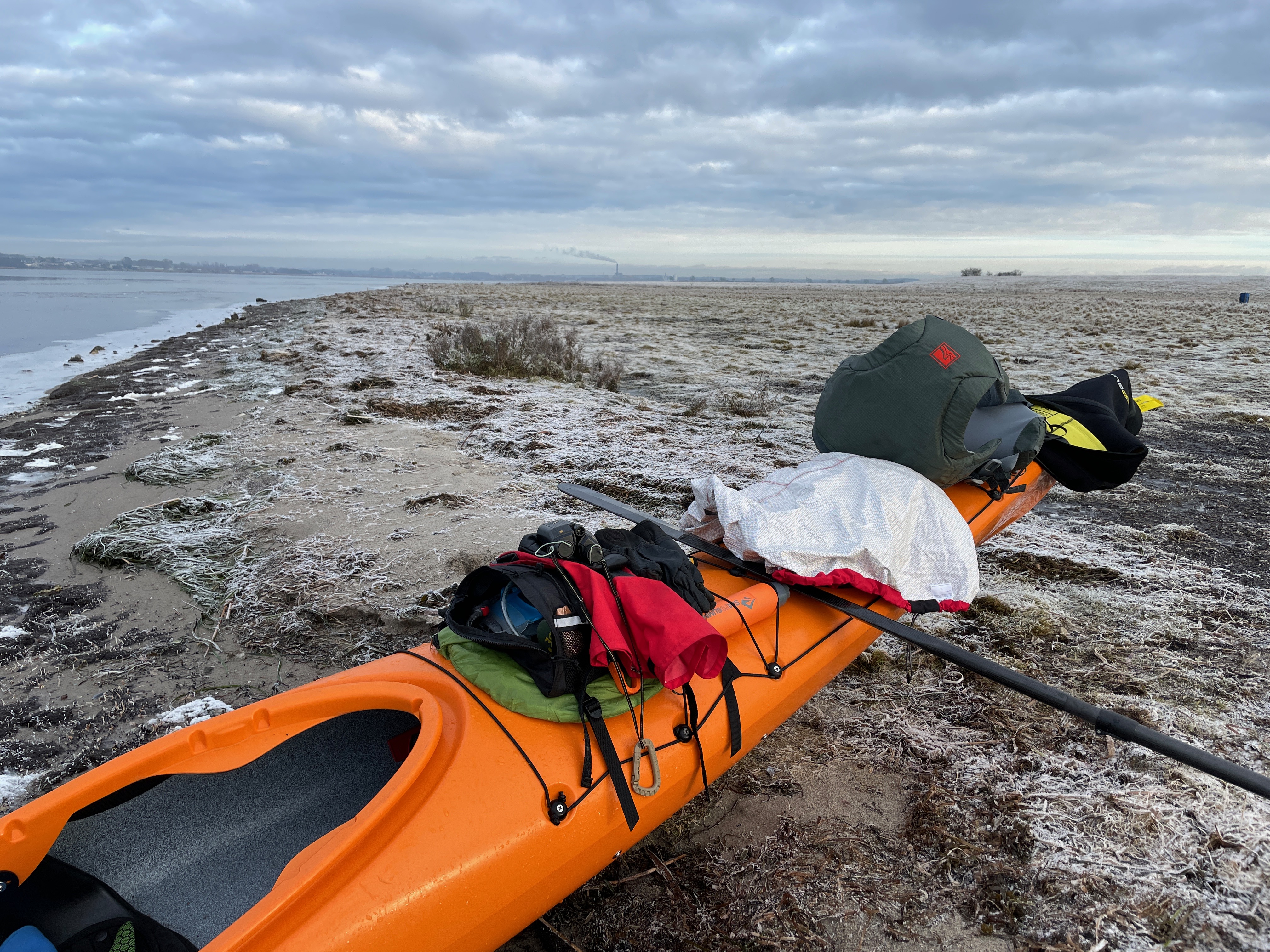 Minutnudlerne kom i truget og varmt vand fra termokanden overhældt. Mens jeg stod og ventede kunne jeg se hvorledes skyerne trak frem på himlen. Det var smukt, men det varslede også regn/slud. Med kikkerten forsøgte jeg at spotte en isfri rute retur til kanalen. Det så ud til at være fint langs modsatte kyst. Jeg ringede hjem for at annoncere at alt var vel og at jeg var på vej hjemover. Efter en kop kaffe smed jeg en podcast i øret og trak kajakken ud i vandet. Lidt puslen med spraydeck og jeg var klar. Det var en dejlig tur tæt op under kysten og jeg fik virkelig brugt “kantning” når kajakken skulle styres. Jeg har ikke ror på, men en finne der kan bruges til at holde retning. Finnen blev trukket op og nu var det primært hoften der stod for styring. En fantastisk hjemtur hvor der gik ren leg i systemet.