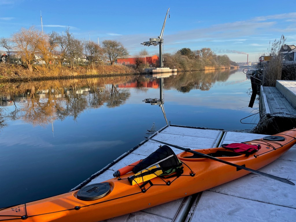 I kanalen stod vandet som et spejl og ingen andre havde fundet på samme ide, så jeg var helt alene på vandet. Uden besvær gled jeg ud af kanalen og med næsten lydløs fremdrift overraskede jeg flere der gik formiddagstur langs kanalen. Grønlænder pagajen er virkelig stille hvis den bruges rigtigt. Et par ænder tumlede ud af sivkanten, de blev også “taget på sengen”. Himlen var uden skyer og jeg kunne faktisk godt have behov for et par solbriller. De lå godt nede i en af lastlugerne, så det måtte vente.