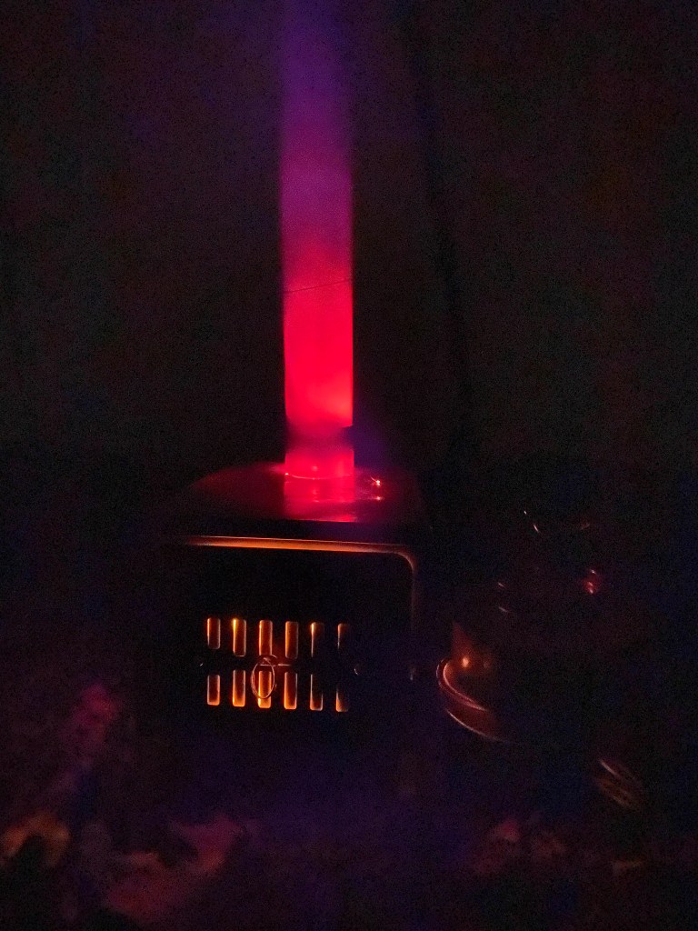 Jeg vågnede brat ved midnatstid. Uden med sikkerhed at vide det, følte jeg at have røget 100 cigaretter på 5 minutter. Jeg famlede lidt efter pandelampen og fandt den siddende på hovedet. Lyset fra lampen afslørede at teltet også så ud som om at cigaretterne var røget herinde! Røgen var helt tæt og jeg fik lige sparket til hustruen og sagt at hun måtte åbne sin side af teltet- og jeg min side. Det hjalp øjeblikkeligt på sigtbarheden. Med en sod-agtig smag i munden begyndte jeg at rode med brændeovnens spjæld. Lige lidt hjalp det- tyk røg stod ud af alle sprækker. Jeg måtte trække i tøjet og kikke skorstenen efter. Åbenbart havde brændet enten været lige fugtigt nok, eller der havde været for meget harpiks i det døde fyrretræ jeg brugte i ovnen. Gitteret i skorstenens top var plastret til af sod-flager og dermed var trækket i ovnen helt væk. Et par slag med en lang kæp afhjalp problemet og straks efter kunne jeg se at røgen igen kom fint ud af skorstenen. En lille lektie var lært: husk HELT tørt brænde og “fatwood” er kun til optænding. Fatwood kommer af nåletræer, der indeholder store mængder af harpiks, gerne fundet på tørre grene på et dødt fyrretræ. Selve kernen på fyrretræet kan indeholde store mængder- fatwood er en gave til en hurtig optænding. Der gik nogle timer før jeg igen kunne sove videre mens smagen af røg ikke skulle slippe før nogle døgn efter!