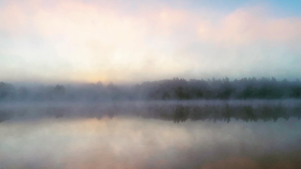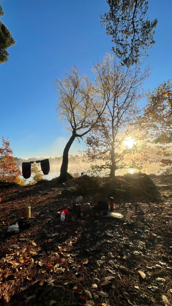 Jeg vågnede ved 6 tiden, ganske som jeg plejer. Men til forskel fra hverdagen, havde jeg ikke behov for at starte op endnu. I stedet tog jeg en lille ekstra lur og ventede på at lyset ville dukke op og bringe varme i teltet. Helt taktisk havde jeg udvalgt pladsen og vendt teltet således at vi fik glæde af morgensolen. Solen brød igennem over trætoppene og disen fra det varmere sø-vand lå som et tæppe ud over hele søen. Det var stadig vindstille og det stod nu klart at det ville blive en meget smuk kajaktur.