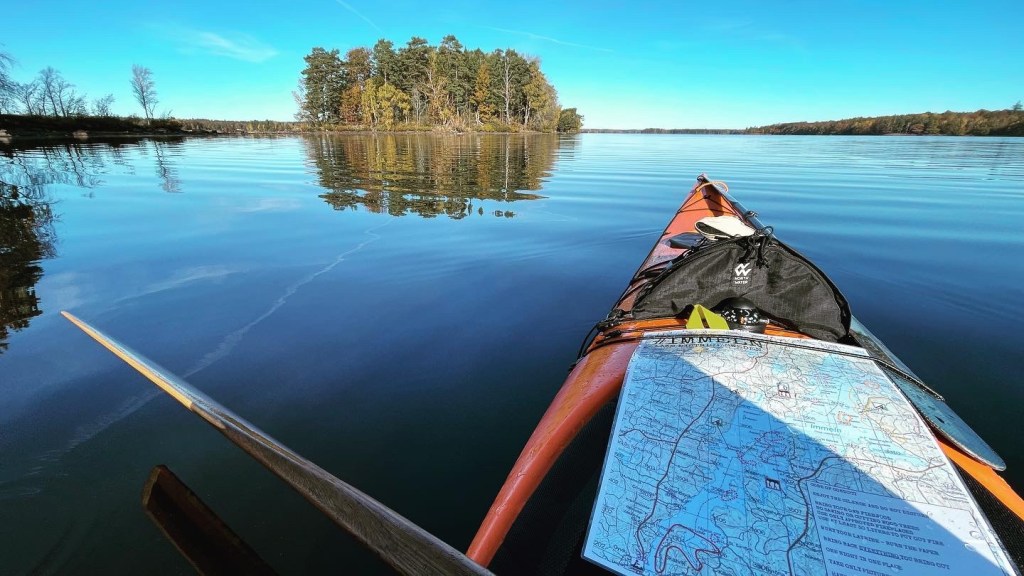 Forude ventede bølger, men kun for en kort stund. Jeg havde vist ruten på kortet. Min hustru kun glædeligt konstatere at vi ville få mere medvind og endda meget mere læ når vi rundede en pynt nogle kilometer fremme. Vi var særligt opmærksomme på undersøiske skær og klipper der lige stak spidsen op i overfladen. En påsejling ville ikke betyde hul i kajakken, men en grim ridse og muligvis overbalance med en efterfølgende rulletur i vandet. Det ville vi gerne undgå, så hver gang klippestykker stak op af vandet, blev vi ekstra opmærksomme og satte farten lidt ned. Efter nogle timer kunne jeg melde at næste mål lå ret fremme, vi havde ramt den rigtige vig i forhold til planen. Navigationen er, når den fungerer, meget tryghedsskabende og selvtillids skabende. De mange årtier med orienteringsløb, navigation under sejlads og kompasgang i dybe skove, er muligvis en af de vigtigste håndværk i friluftslivet…