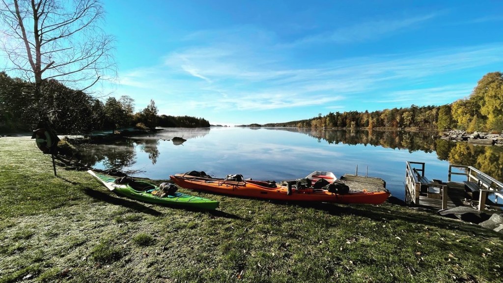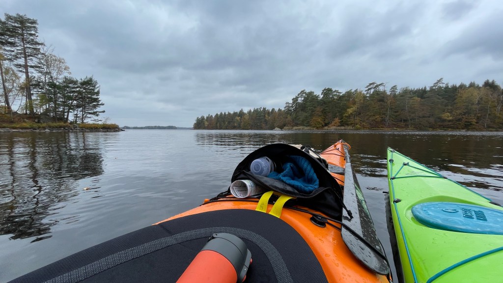 Kajakkerne blev pakket og der var rigeligt med plads, endda så meget plads at der kom to stole, et lille bord og brændeovnen -med. Vi skiftede over til “kajak-kluns” og fik måsen klemt ned i kajakkens cockpit. Spraydecket forseglede åbningen og vi var nu mere eller mindre vandtætte- skulle uheldet være ude.