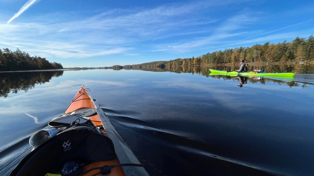 Selvom jeg er vant til at ro i kajak, så er de første par minutter altid lidt forsigtige. Balancen skal lige findes og trygheden kommer for hvert tag med pagajen- eller rettere sagt “Grønlands åren”. Jeg har for lang tid siden valgt denne type pagaj til langture. Den er mere skånsom syntes jeg. Den skal ikke vinkles så stejlt ned i vandet- hvilket gør at armen ikke kommer over skulderhøjde.