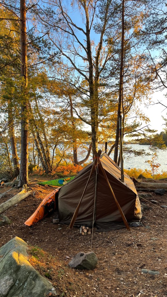 Vandstanden var meget lav og de klipper der normalt var under vand, var nu fritlagte og glattere end brun sæbe. Som en kolos på lerfødder bar vi kajakkerne op på øen. Solen havde godt fat og det var muligt at opsætte lejren iført t-shirt. Teltet blev sat og brændeovnen foldet ud og skorstenen rullet ud- og rullet sammen på den lange led. En ovn der samlet vejer 1,7 kg og ikke fylder mere sammenpakket, end et fyldt ringbind- og det er inkl skorsten, bål-handsker og brændhæmmende underlag.