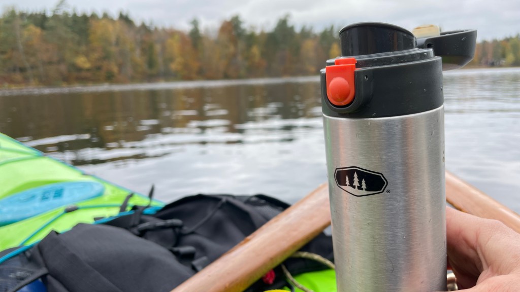 Vi roede nogle timer inden en kaffepause synes at være tiltrængt. Jeg nærstuderede kortet og kontrollerede vores position. Selvom “allemandsretten” er gældende, er der fredede områder – en del endda. Jeg ønskede absolut ikke at anløbe en fredet ø for at drikke kaffe og strække benene. Hurtigt fandt jeg en autoriseret plads, hvor der også var shelters- skulle vi få lyst til at stoppe allerede. Et hurtigt eftersyn med kikkerten bekræftede at der var ledigt. Vi gled forsigtigt ind, der er mange granitsten langs kysterne og ingen grund til at ridse kajakken mere end højest nødvendigt. En skovmår dukkede op og fulgte nysgerrigt med. Vi fandt os tilrette i solen og nød kaffen samt lidt chokolade. Med kikkerten spejdede jeg ud over søen og kunne kun se to kanoer- resten af synsfeltet var helt mennesketomt.