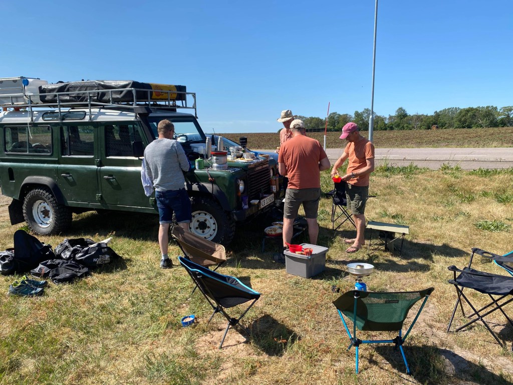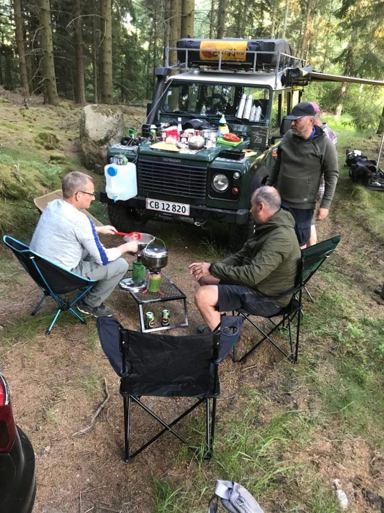 Ikke underligt at vi fik lidt opmærksomhed fra de lokale. Vi var svære at undgå at se, med den store LandRover og diverse køkkensager. Snart bredte sig en duft af morgenmad over pladsen. Med stor appetit fortærede vi maden. Vores lille gruppes selvforståelse fik medvind, da flere unge damer cyklede forbi. Det blev i hvert tilfælde den historie der havde den største gennemslagskraft. Tør jeg overhovedet tænke hvad historien har udviklet sig til, næste gang vi skal afsted! For det er helt sikkert at vi igen skal mødes. I skrivende stund er en ny dato ved at finde sin plads, samt indholdet af turen.