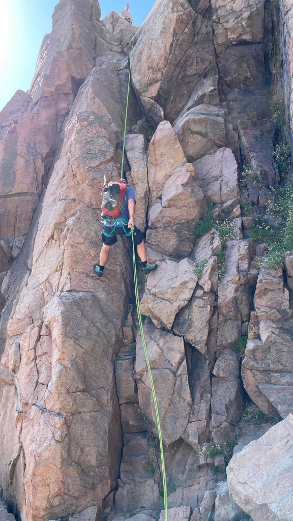 Vi navigerede rimeligt sikkert til toppen af klatreruterne. Med det øgede behov for sikkerhed var det alligevel behageligt at kunne starte klatringen med et top anker (sikring fra toppen). Med opsat top anker, rapellede vi ned til bunden og skiftede sko.